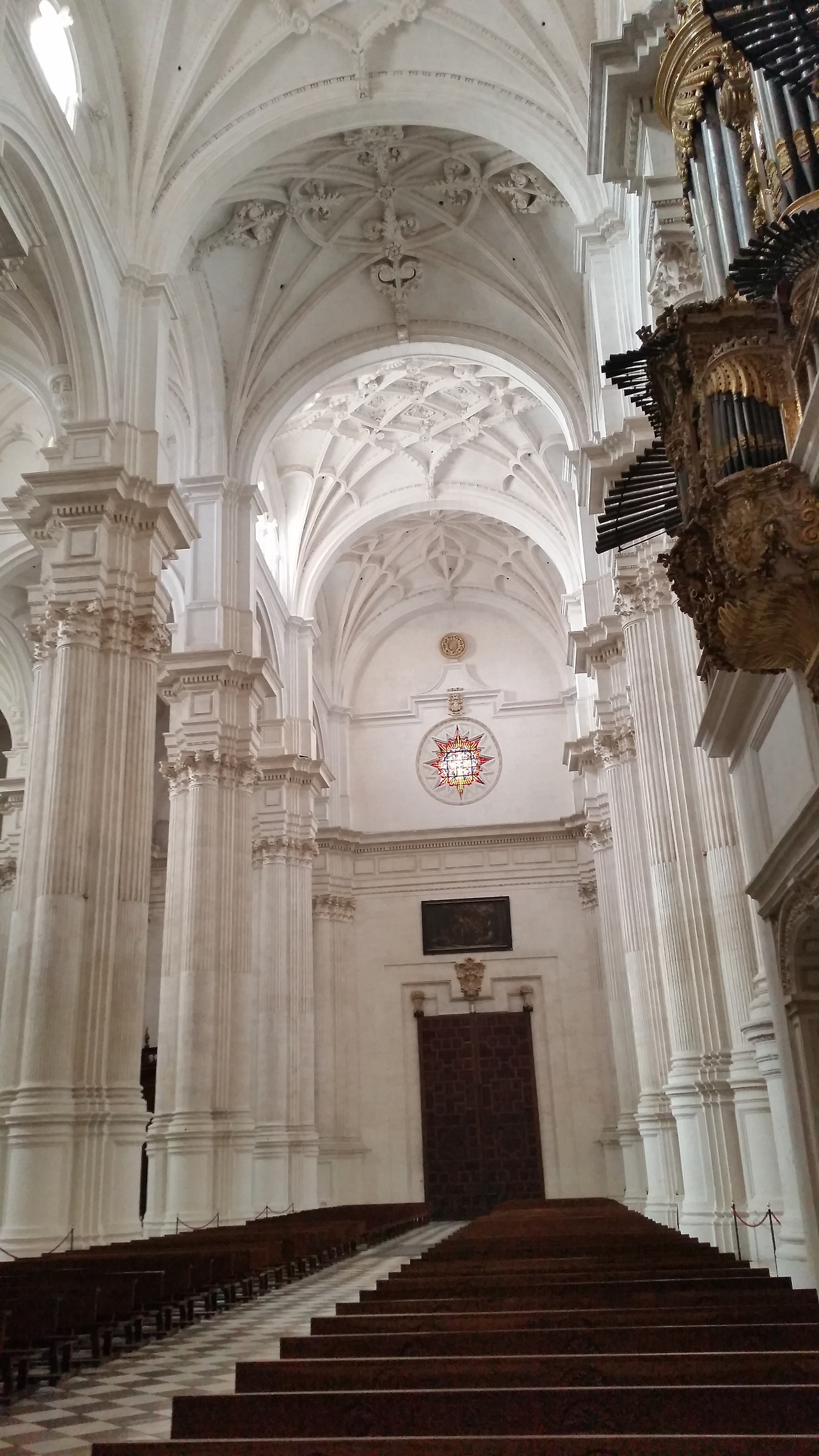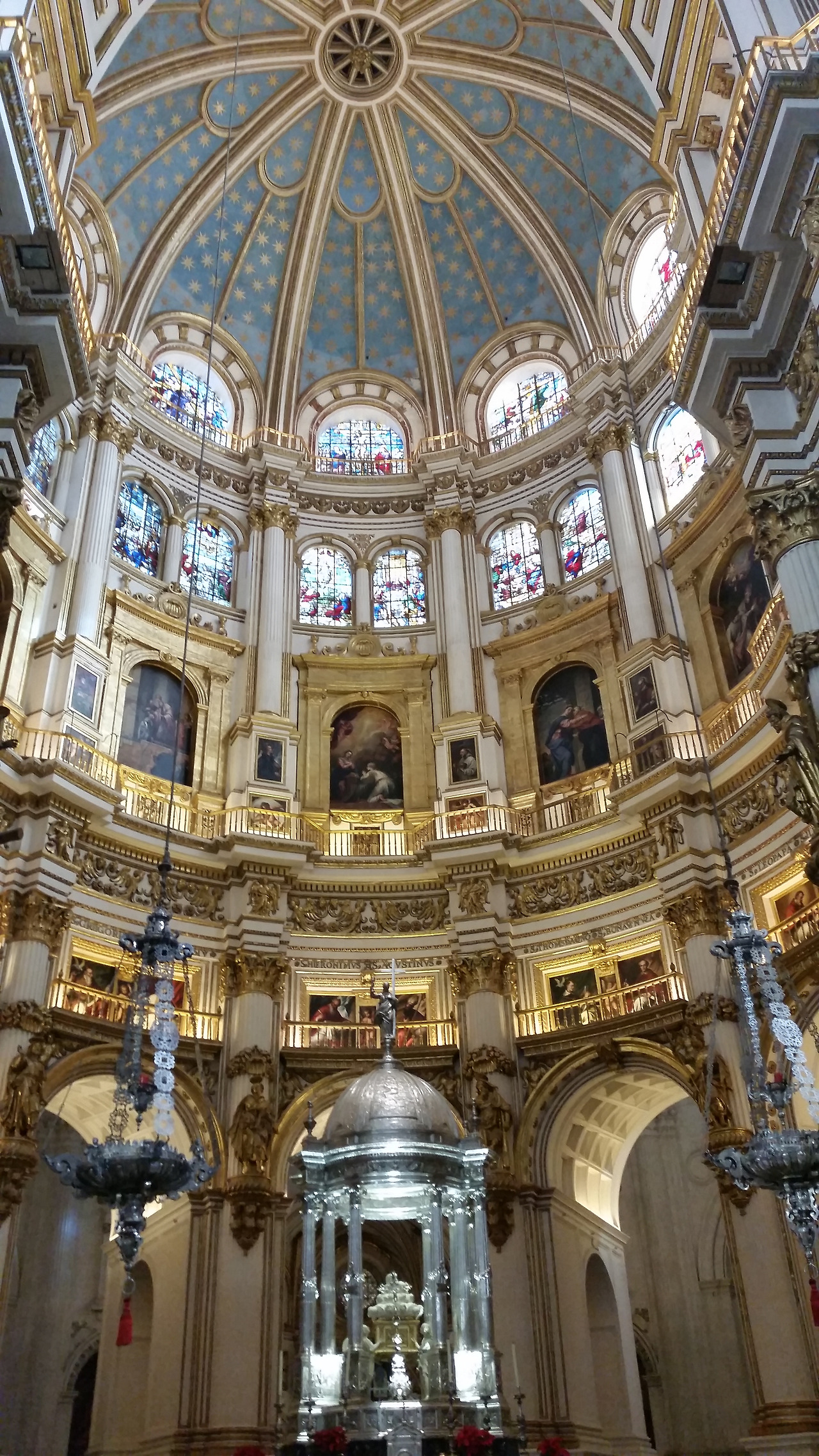 성당 안에 들어서니 어마어마한 하얀 석조기둥들이 입이 떡 벌어지게하고, 황금장식과 스테인드글라스가 햇살에 눈부시게 빛난다. 그라나다 성당은 말라가 성당이나 론다의 성당과는 또 다른 느낌이다. 아기자기한 면은 없지만 거대하고 웅장하고 또 차갑다. 마치 이른 아침에 면도를 하고 싸~한 스킨을 바른 남자 같다고 할까?