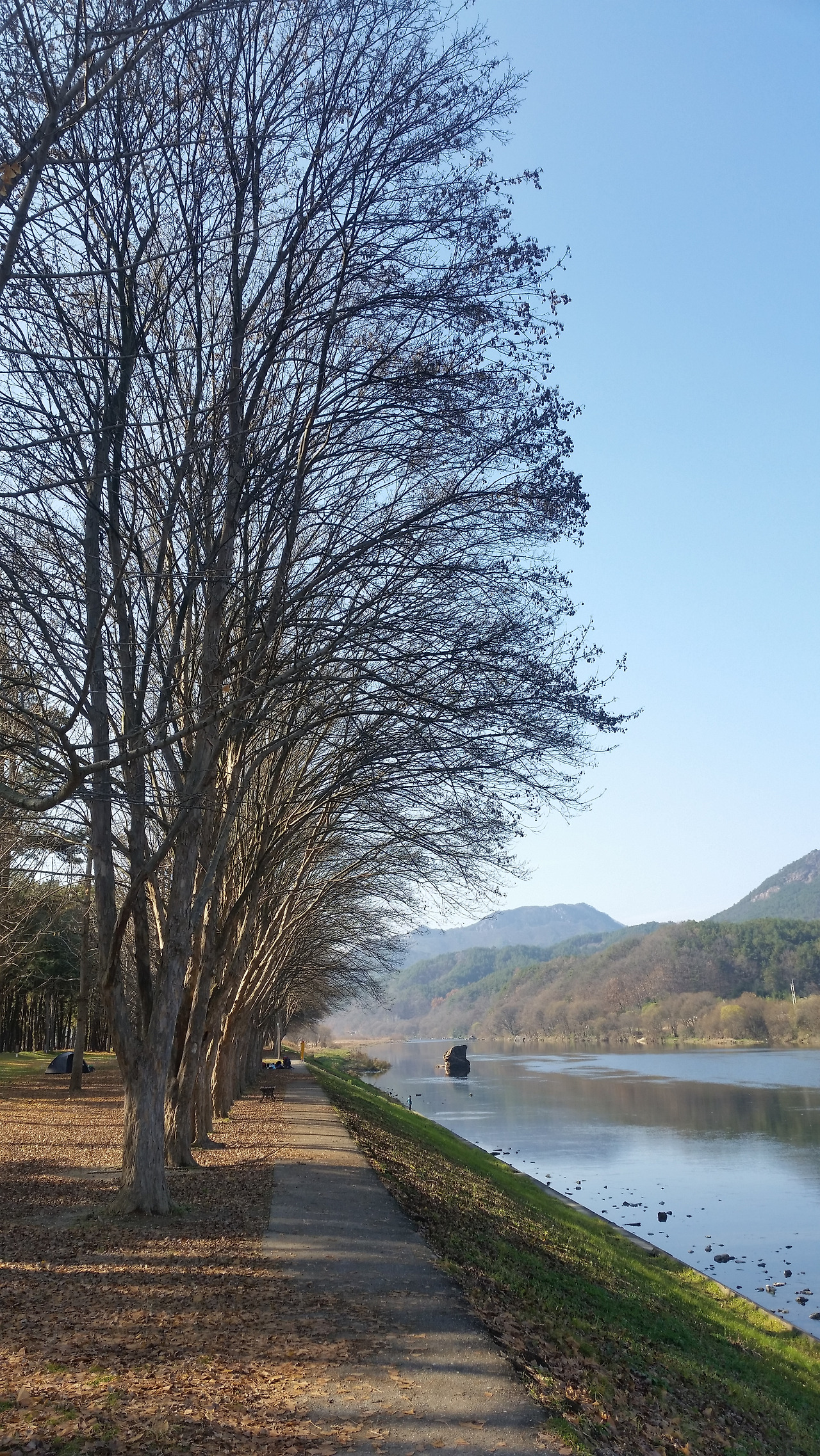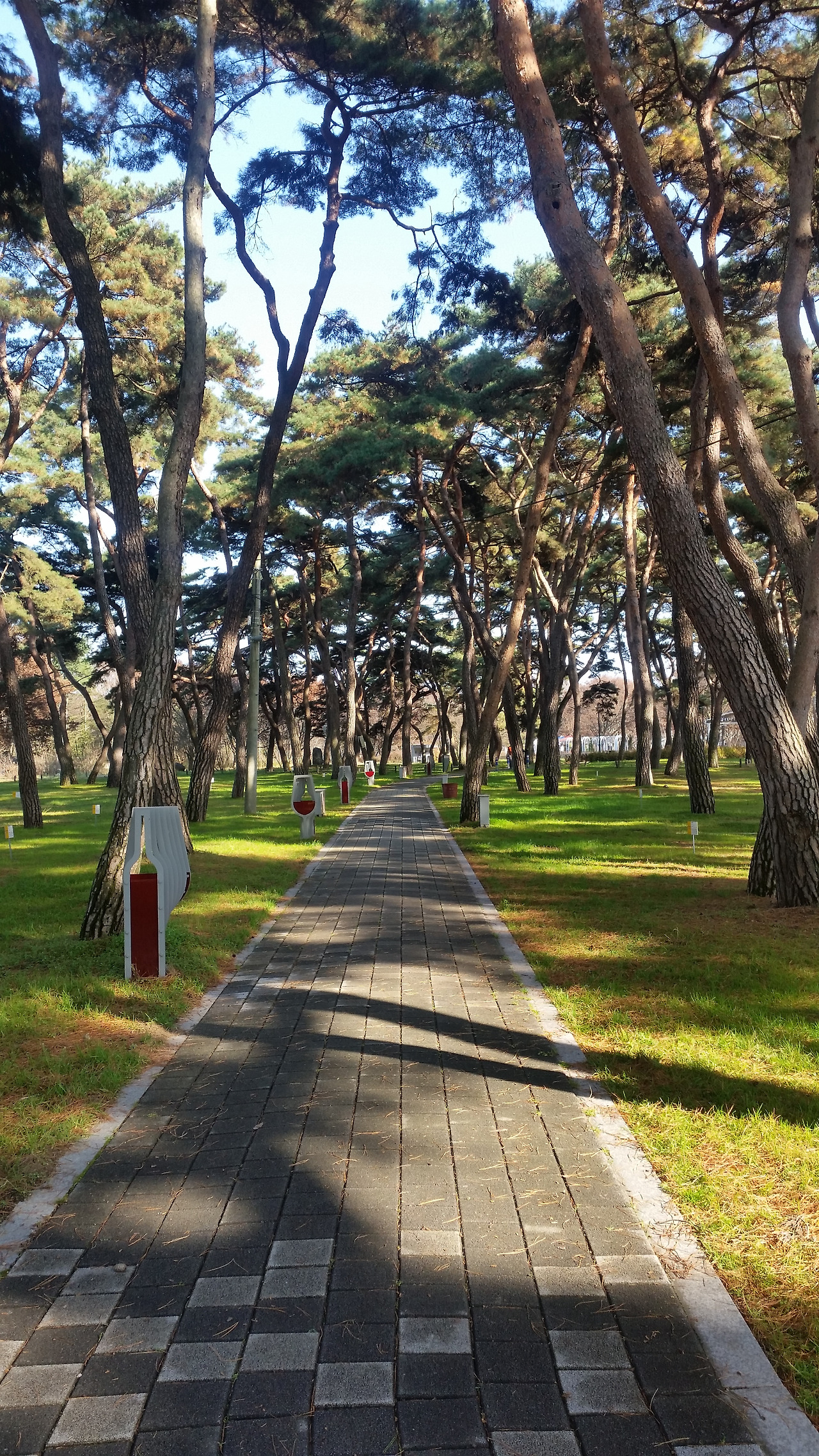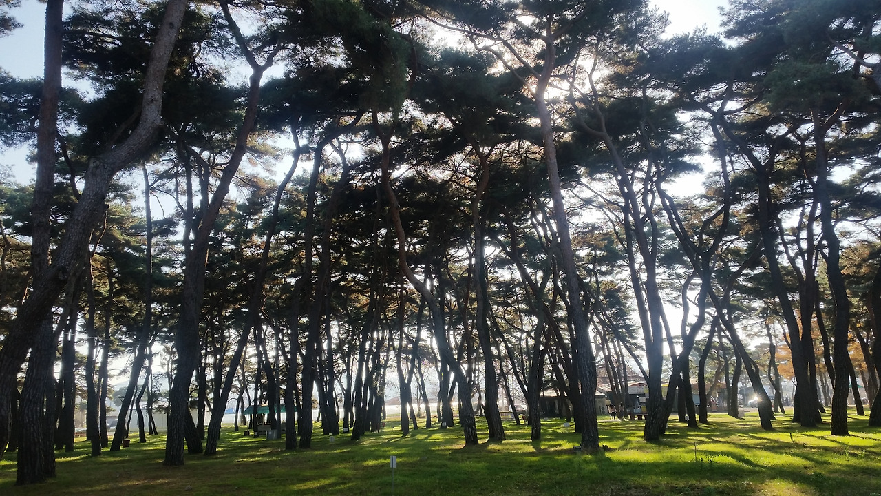 차로 2분여를 더 달려 송호유원지에 도착했다. 그 동안 여러 차례 와봤지만 이런 늦가을에 온 건 처음이다. 입구에 들어서자마자 소나무숲이 보인다. 초록색 융단 위에 푸른 소나무 그리고 나무 사이로 들어오는 햇살. 소나무숲만 보면 지금이 봄인지 가을인지 아니면 여름인지 정말 가늠이 안 된다. 소나무숲에 감탄하며 안쪽으로 걸어들어가면 이번엔 소나무향이 폐 안쪽 깊은 곳까지 훅 들어온다. 정말 깊고도 신선한 그리고 깨끗한 향이다. 그 어떤 방향제도 따라올 수 없는 말로 설명할 수 없는 향이다.