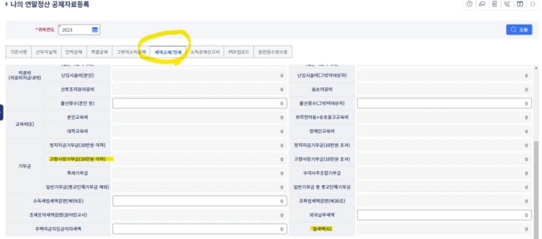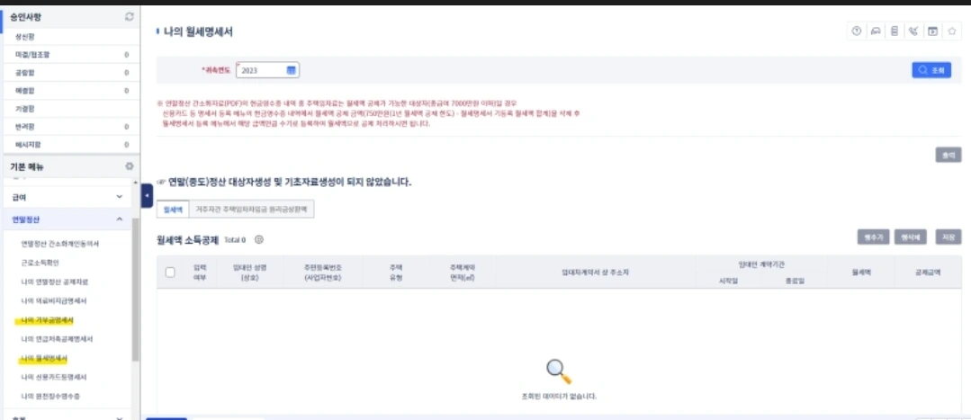 정산 공제자료 > 귀속년도 2023년 확인 >조회