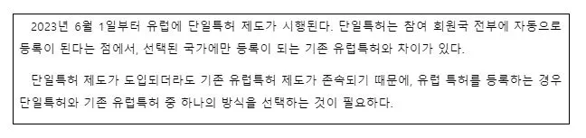 이상과 같이 단일특허에 대하여 필수적으로 이해가 필요한 부분을 정리하였다. 다만, 단일특허를 할 것인지 기존 유럽특허로 진행할 것인지에 대한 사항이나 옵트-아웃 여부를 결정하는 사항을 기업에서 의사결정하기는 쉽지 않은 사항이므로, 전문가와 상의하여 결정하는 방안을 제안한다.