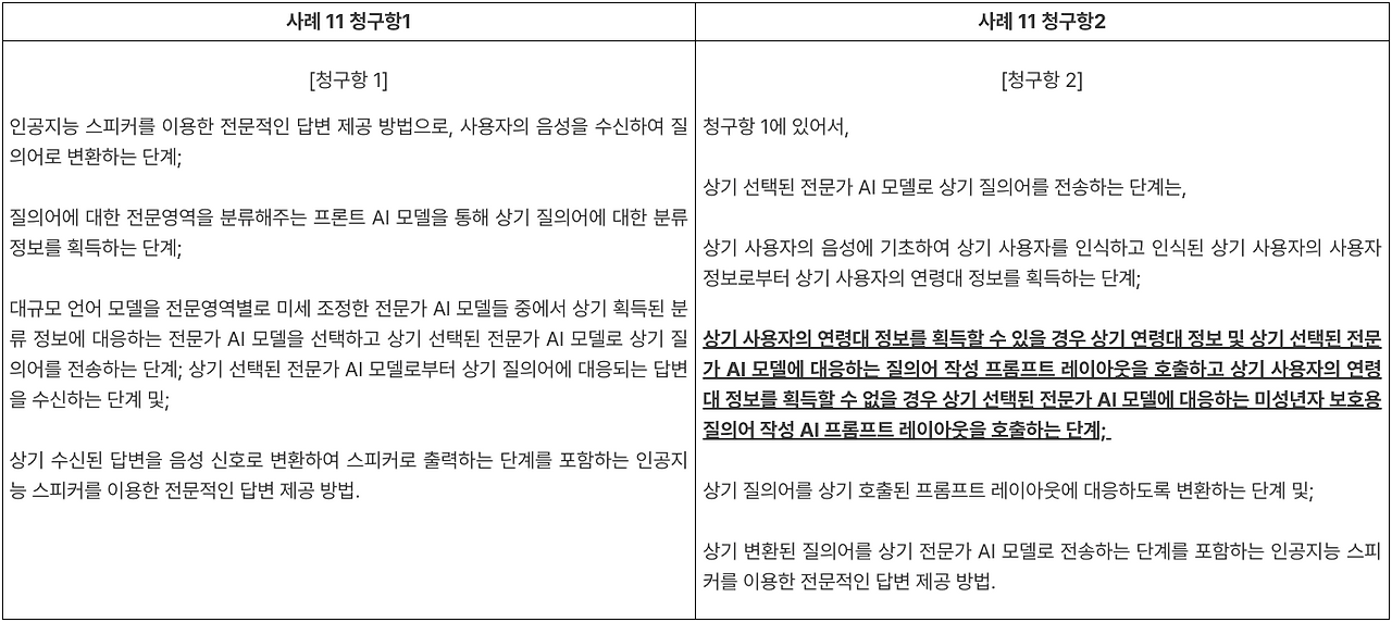 사례11이 시사하는 바는 명확하다. 생성형 AI 모델의 단순한 조합이나 적용만으로는 특허성을 인정받기 어렵고, 특정 사용자 그룹이나 상황에 맞춘 맞춤형 프롬프트 설계가 기술적 구성으로서 진보성 인정의 핵심 요소가 될 수 있다는 것이다. 이는 프롬프트 엔지니어링이 단순한 질의 작성 기법을 넘어, 하나의 독립적인 기술적 구성 요소로 인정받을 수 있는 가능성을 명시적으로 열어주었다는 점에서 실무적 의의가 크다.