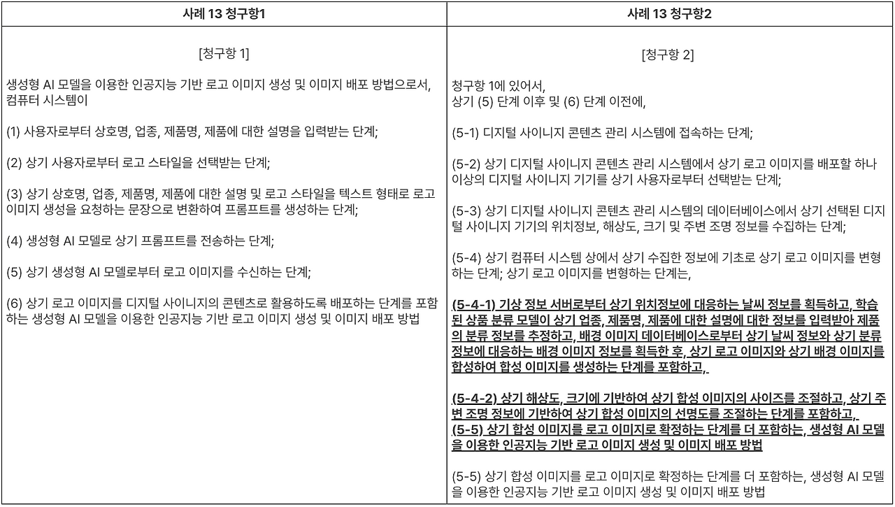 사례13의 핵심은 '생성 이후의 기술적 처리'에 있다. 생성형 AI로 콘텐츠를 생성하는 것 자체는 진보성을 인정받기 어렵지만, 생성된 콘텐츠를 실제 환경(디지털 사이니지)에 최적화하기 위한 장치 특성 수집, 환경 정보(날씨, 조도) 반영, 자동 적응 등의 후처리 기술 구성이 결합될 때 진보성이 인정될 수 있다는 것이다. 이는 생성형 AI의 출력물을 현실 세계의 특정 하드웨어나 환경 조건에 맞추어 가공하는 기술이 독립적인 진보성의 근거가 될 수 있음을 분명히 보여준다.