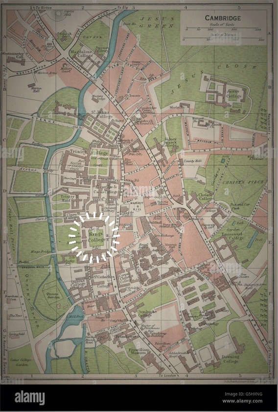 킹스는 케임브릿지의 중앙에 위치한 컬리지다. 첫번째 포스터상 7번째 Crest를 가지고 있고 위 지도의 하이라이트 친 부분에 위치하고 있다. 킹스 학생들은 저 위치에 있는 킹스 컬리지에서 자고, 먹고, 공부하고 논다. 그런 다음 강의를 들으러 각자의 강의실 혹은 디파트먼트(학과 건물)로 뿔뿔이 흩어졌다 돌아오는 것이다. 다른 컬리지 사람들은 다른 위치에 있는 다른 컬리지에서 비슷한 일상을 보낸다.