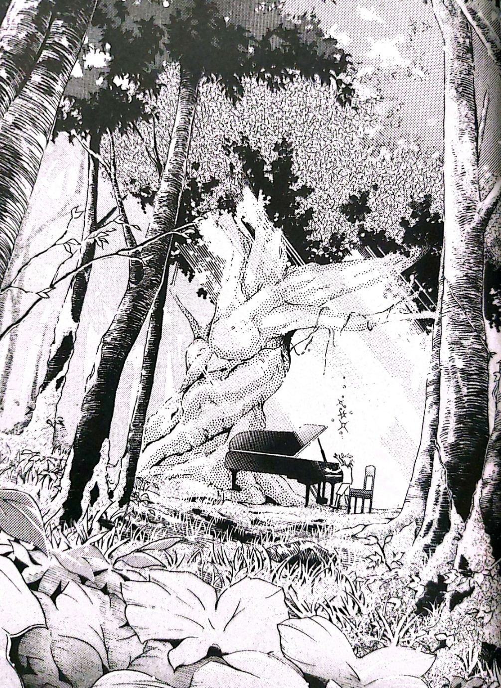 세 살 때 2층 방에서 떨어져 죽은 줄 알았던 카이는 나무에 걸려 산다. 그 나무 옆에 있던 피아노를 발견하며 장난감이자 친구가 되었고 어린 엄마 레이코를 도와 소년을 키워낸다. 과거 천재 피아니스트 아지노의 전용으로 제작된 피아노는 영광의 음을 내며 찬란한 시간을 살지만 그가 연주자의 생명을 잃은 뒤 헐값에 카바레 주인에게 팔린다. 그러나 무거운 특수 건반으로 만들어져 다른 사람은 쉽게 치지 못해 쓸모가 없어 숲에 버려진다. 연주자의 손길을 받지 못해 악기로서 생명력을 잃게 된 피아노는 카이와 만나 매일 어루만져지며 다시 소리를 내게 되었고 잃었던 생명의 불씨가 되살아났다. 숲의 피아노 소리를 오직 카이만이 낼 수 있는 것은 각각이 숲을 통해 제2의 생명 얻어 한 배에서 잉태된 유대로 소리로서 공명하는 사이가 되었기 때문으로, 버려진 피아노의 회복은 과거 피아노와 일심동체였던 연주자 아지노가 카이라는 원석을 키워내는 지도자로 다시 살 게 하는 힘을 불러일으킨다.