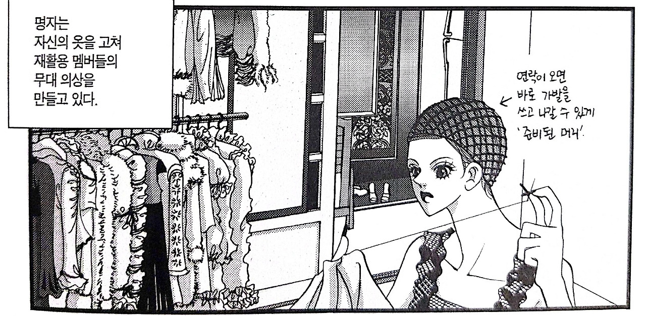 명자는 자신의 옷을 고쳐 무대의상을 만들고 돈이 되는 옷은 팔아서 자금을 만든다 / 이미지- 단행본 발췌