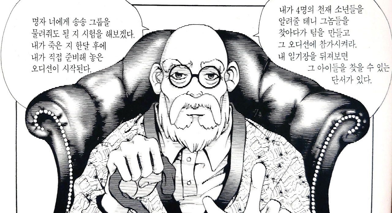 송 송 회장의 유언으로 천재 소년들을 찾아 오디션에 참가해야 하는 모험이 시작된다 /이미지- 단행본 발췌