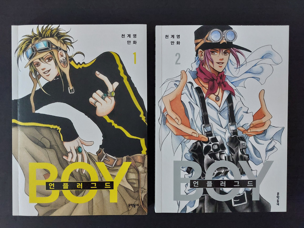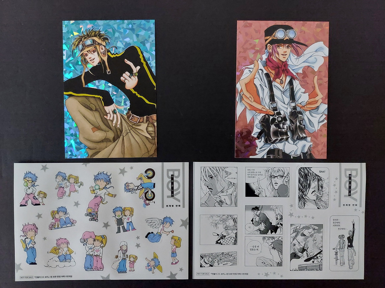 작품 탄생 28년 만에 복간된 <언플러그드 BOY>의 초판본과 그 안에 들어 있던 엽서와 스티커. 1권 표지와 같은 엽서에는 천계영 작가의 특별 메시지가 있다/개인 소장