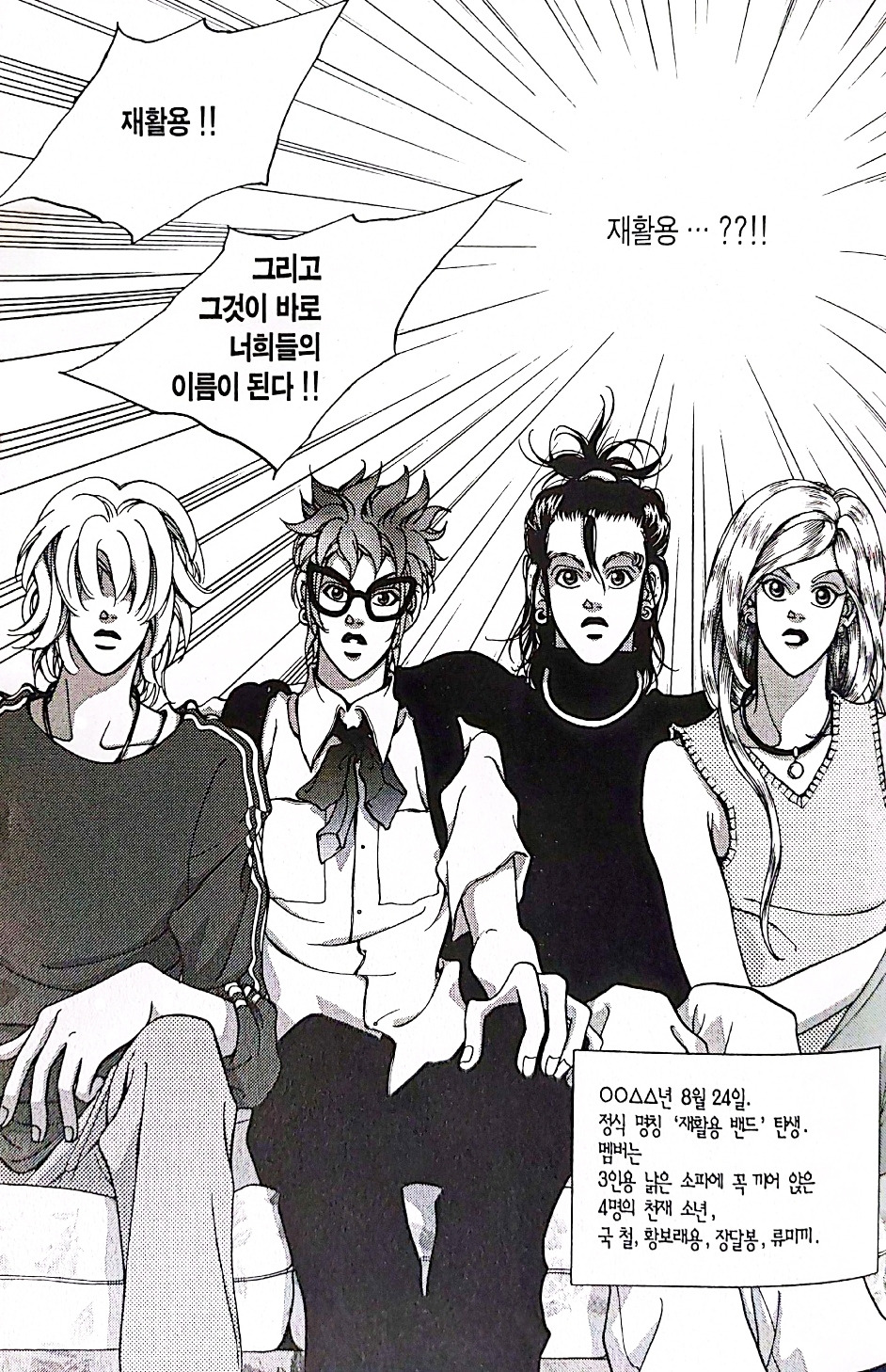 만화 <오디션>의 초판본 전권과 작품의 주인공인 네 명의 음악 천재들로 결성된 '재활용밴드'의 탄생 장면 / 이미지- 개인 소장, 단행본 발췌