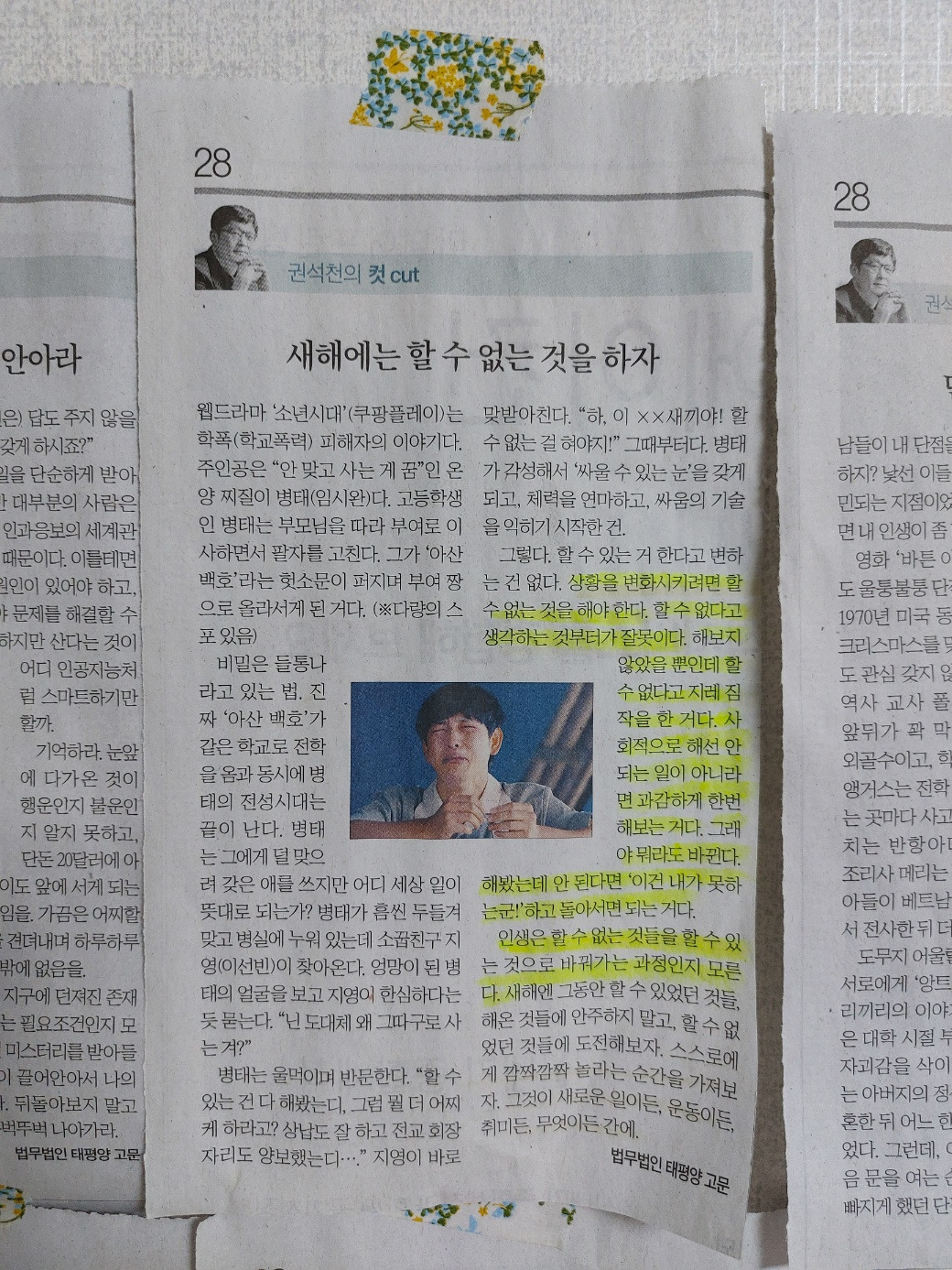 아무나 신문에 기고할 수 있는 건 아니지만 누구나 신문에서 감응을 받는 건 아니다. 나는 그의 글을 보며 힘들었던 지난날의 선택과 후회들을 조금씩 마주하게 되었다. 특히나 고마운 글이 있다. 2024년 1월 5일 금요일에 실린 <새해에는 할 수 없는 것을 하자>의 일부분이 내 어깨를 토닥이며 응원했다.