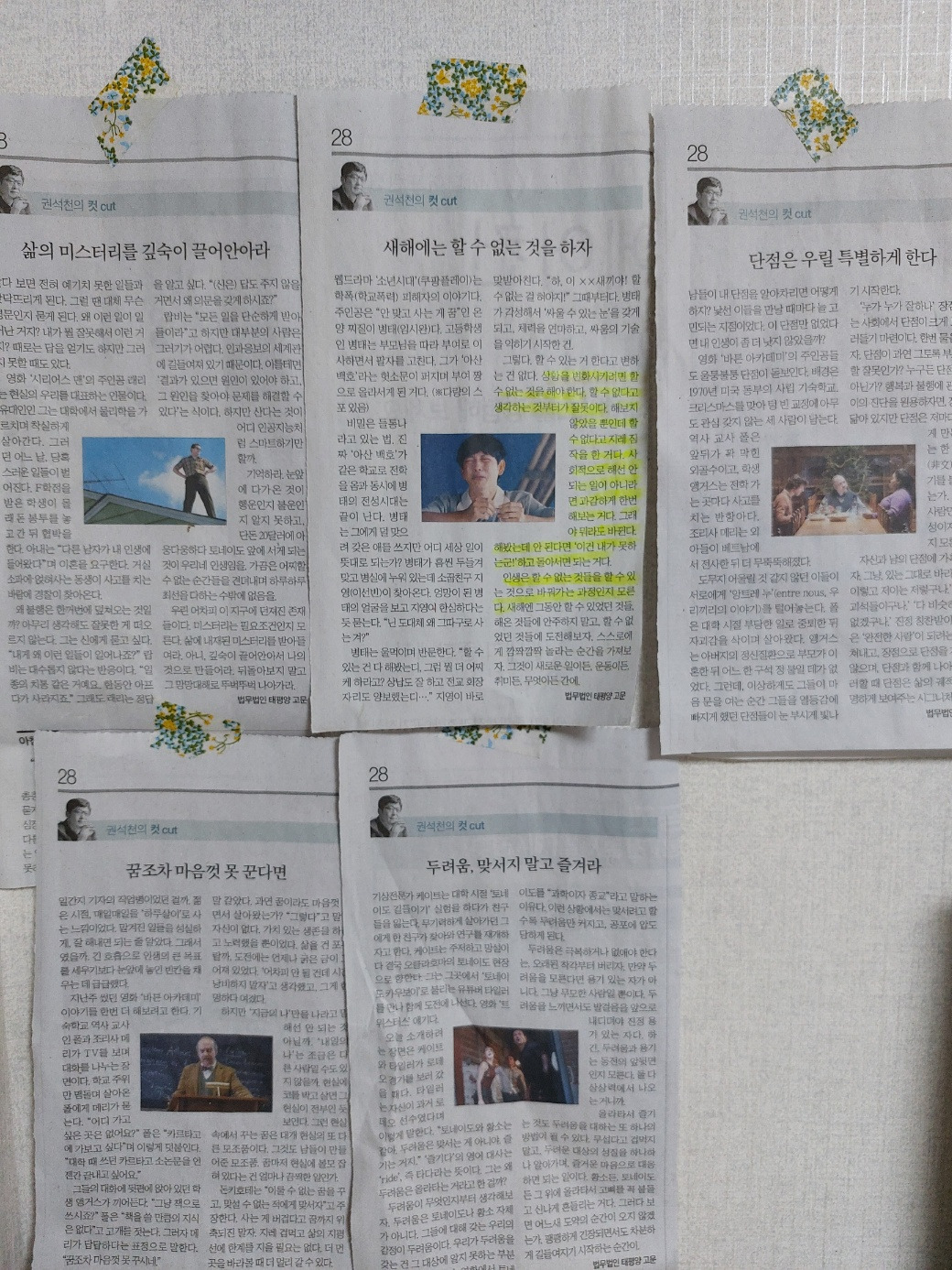결심의 불씨를 지핀 글 외에도 이후에 나온 주옥같은 글들은 왠지 모르게 그가 나를 알고 알맞춤으로 조언해 주는 듯했다. 영험한 기운의 부적처럼 벽에 붙인 그의 글들은 불안함이 피어오를 때마다 한 번씩 쳐다보며 다시 마음을 다잡게 한다. 자신의 글이 타인에게 이러한 영향을 준다는 것을 그도 알까? 무서움에 주저하던 나를 일으킨 고마운 글과 만나기 위해 매주 다가오는 금요일이 좋았다. 25년 1월 3일 금요일 아침, 신문엔 새로운 필진이 그 자리를 대신하지만 그가 28면에서 내게 주었던 용기는 여전히 가슴에 남아 있다. 지금 힘든 상황에 있는 또 다른 사람에게도 때에 맞는 글이 찾아와 힘을 얻는 계기를 만들 수 있기를 바라본다.