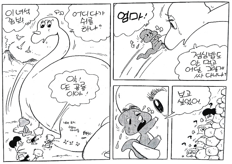 (이후 1996년 개봉한 극장판 애니메이션에서 김수정 작가는 둘리 엄마도 케라토사우르스의 몸으로 그려 설정 오류를 바로 잡지만 개인적으로는 거대한 모습의 엄마 공룡이 더 좋다.)