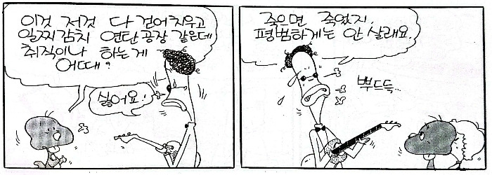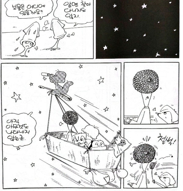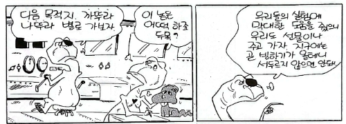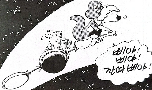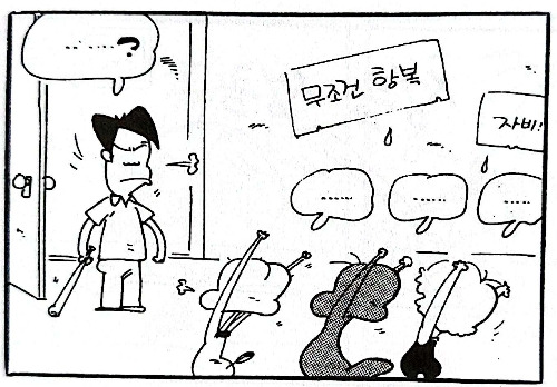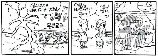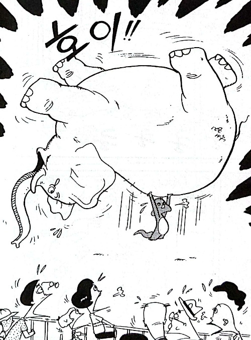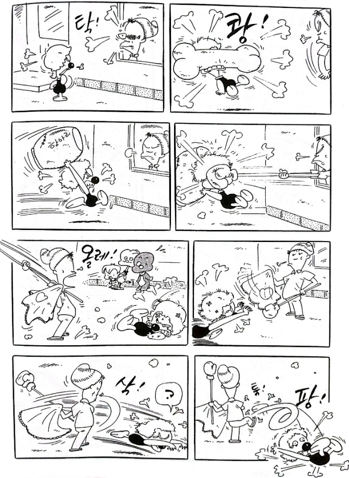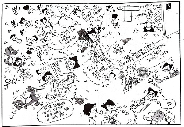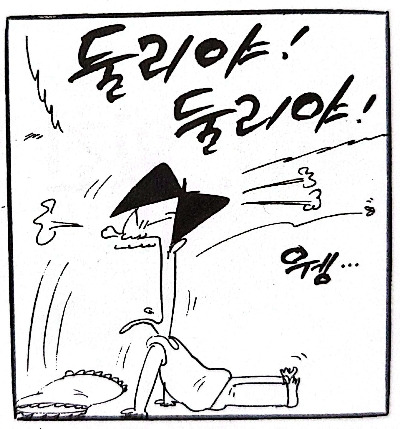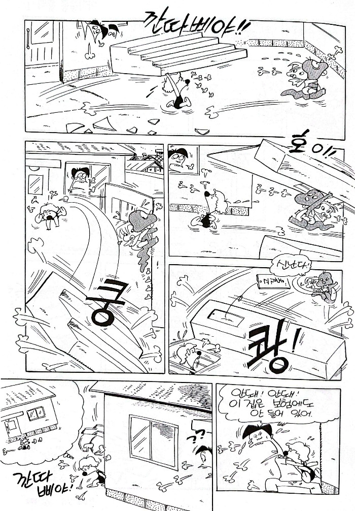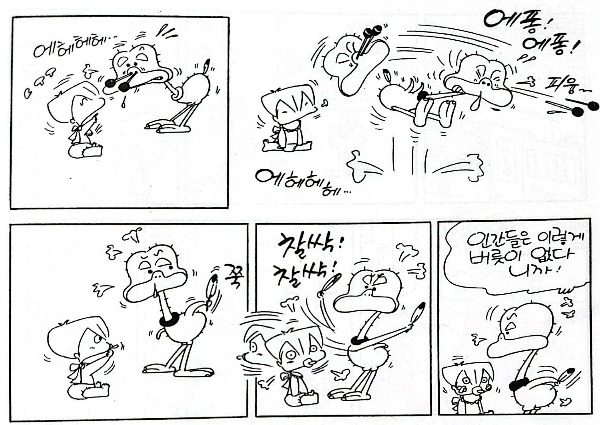 <아기공룡 둘리>에 시종일관 원초적인 웃음을 주는 '몸개그'는 캐릭터의 움직임을 철저히 생각해 만든 슬랩스틱 코미디의 정수를 보여준다. 만화의 이야기에 재미를 더하는 재치 있는 대사도 그림의 움직임이 만드는 시각적 유연함이 있기에 따로 또 같이 돋보이는 것이다. 작가는 만화적 세계가 펼쳐지는 사각의 프레임도 필요에 따라 외곽의 실제 세계로 넘나들기를 주저하지 않고 공상과 현실을 연결하는 요소로 무엇 하나 허투루 쓰지 않는다. 이렇듯 노련한 화가의 면모는 찬란한 명작을 완성하는데 기여했다.