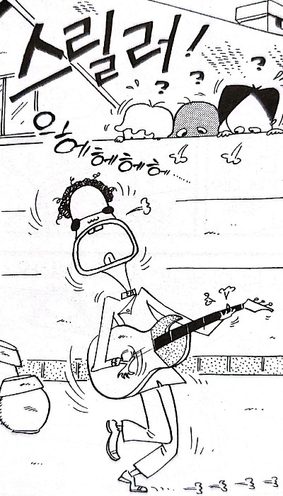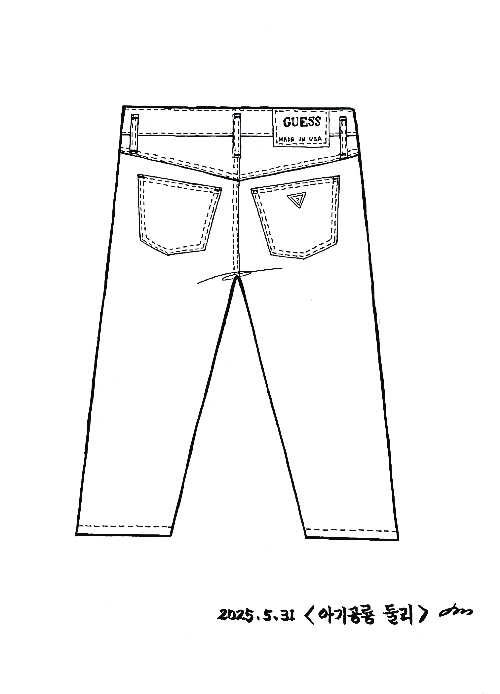 게스 청바지 하면 단번에 떠오르는 역삼각형 모양의 로고 라벨은 오른쪽 뒤 포켓에 부착되어 브랜드의 아이덴티티를 상징한다. 국내엔 1989년부터 진출했던 게스 청바지는 멋을 아는 청소년들과 어른들이 기꺼이 비싼 돈을 주고 사 입었던 인기 절정의 옷으로, 스톤 워싱으로 자연스럽게 물이 빠진 데님에 부착된 게스의 역삼각형 마크는 그야말로 청춘의 표상이었다. 길동의 데님은 단순한 그림의 명랑만화에 특성이 더해저 옷의 모양이 자세히 보이지 않는다. 이 또한 브랜드의 상징인 퀘스천 마크처럼 생략된 옷의 표현에 궁금증을 불러일으켜 오히려 게스 청바지스러움을 잘 표현해낸 거라고 여겨진다.