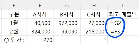 1월과 2월 각각에서 최고의 매출액을 추출하여 표시하는 수식이다. 어딘지 익숙한 방식인 것 같아서 미소 짓는 회사원이 있을지도.... 문제는 이 엑셀 파일을 재사용하기 위하 행이나 열이 추가되고 매출액이 바뀌면 '최고'의 값의 위치가 당연히 바뀐다. 매번 최고 값을 찾아 셀에 입력할 수도 있을 것이다. 하지만 데이터의 양이 매우 많아지면 얘기가 달라진다. 모든 행에서 가장 큰 값을 일일이 지정할 수 도 없고 난감하다. 가장 쓰기 좋은 Max 함수를 사용했더라면 좀 나았을 것을... 엑셀 실력이 잘 늘지 않아 고민하는 회사원의 대표적인 사용법이다.