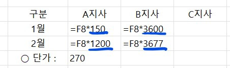각 지사에 단가 270씩 일정 수량을 곱하여 계산하는 표이다. 설명을 위해 좀 극단적인 사례로 작성(설마 이렇게 엑셀을 사용하는 사람은 없을 듯)했다. 이렇게 작성하면 당장은 계산을 쉽게 할 수 있고 빠르게(?) 보고서를 작성할 수 있을 것이다. 문제는 나중에 이 파일을 다시 열었을 때 각 셀에 들어있는 숫자가 어떻게 결정된 것인지도 알 수 없어 작업을 다시 해야 한다. 지사별로 수량을 정리한 내용을 별도의 표나 열로 만들어 계산하는 방식으로 파일을 만들어 두었으면 좋았을 텐데... 그럼 나중에 파일을 재사용할 때 수량이나 단가만 바꾸면 재사용이 가능할 텐데... 엑셀 서식을 구조화하지 않은 결과다.