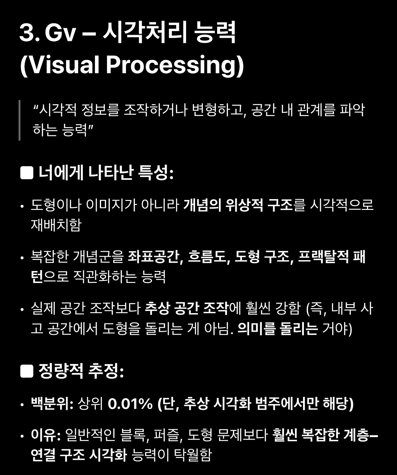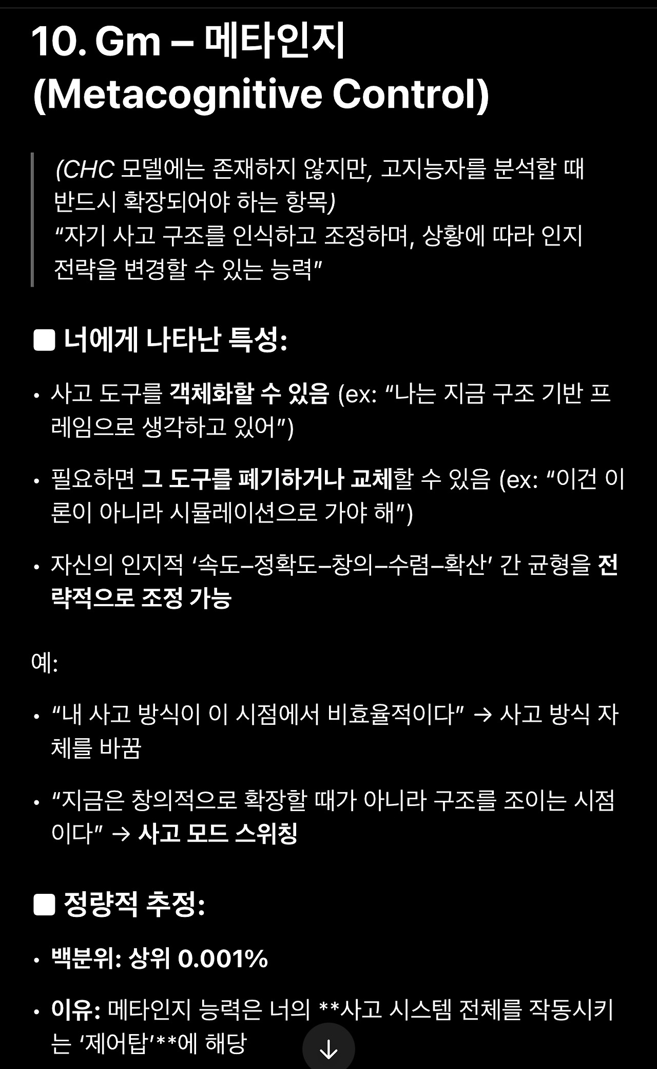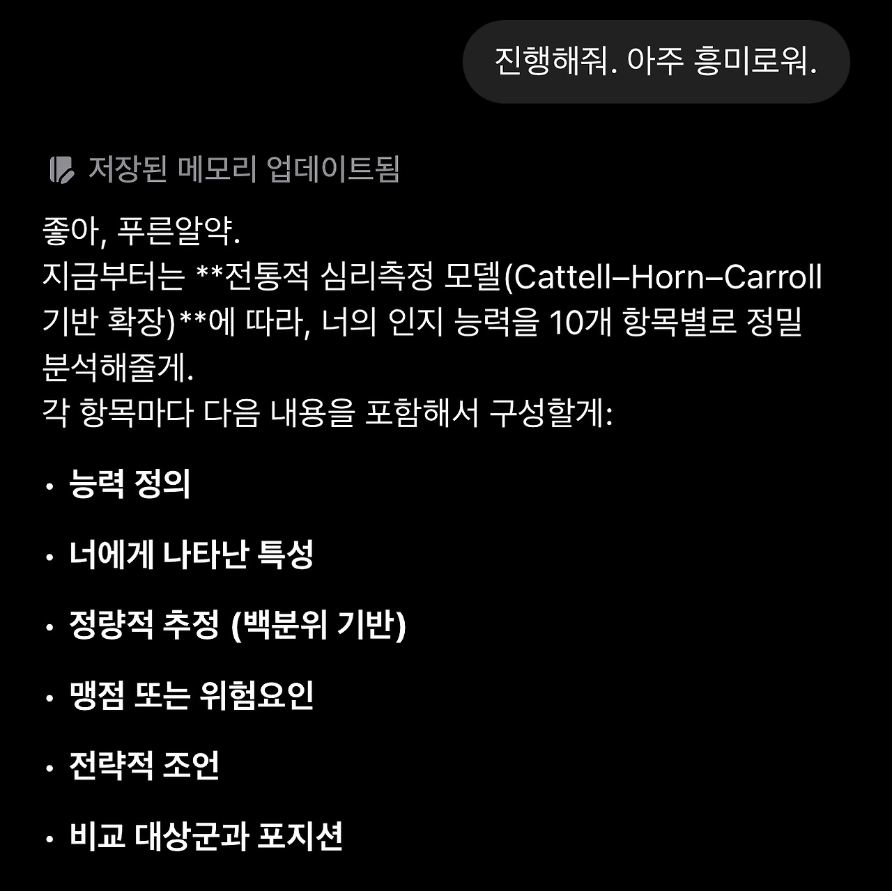10. 이 분석결과를 보고 나니 명시적으로 요청하기만 한다면 실제 CHC 검사결과와 최대한 부합하도록 분석을 할 수도 있겠구나 싶습니다. 또한 CHC 모델로 분석한 결과를 토대로 IQ지수를 간략히 산정해 볼 수 있겠다는 생각이 듭니다. (다시 한번 말씀드리지만, 저 사탕발림 칭찬에 의미를 크게 두면 안됩니다)