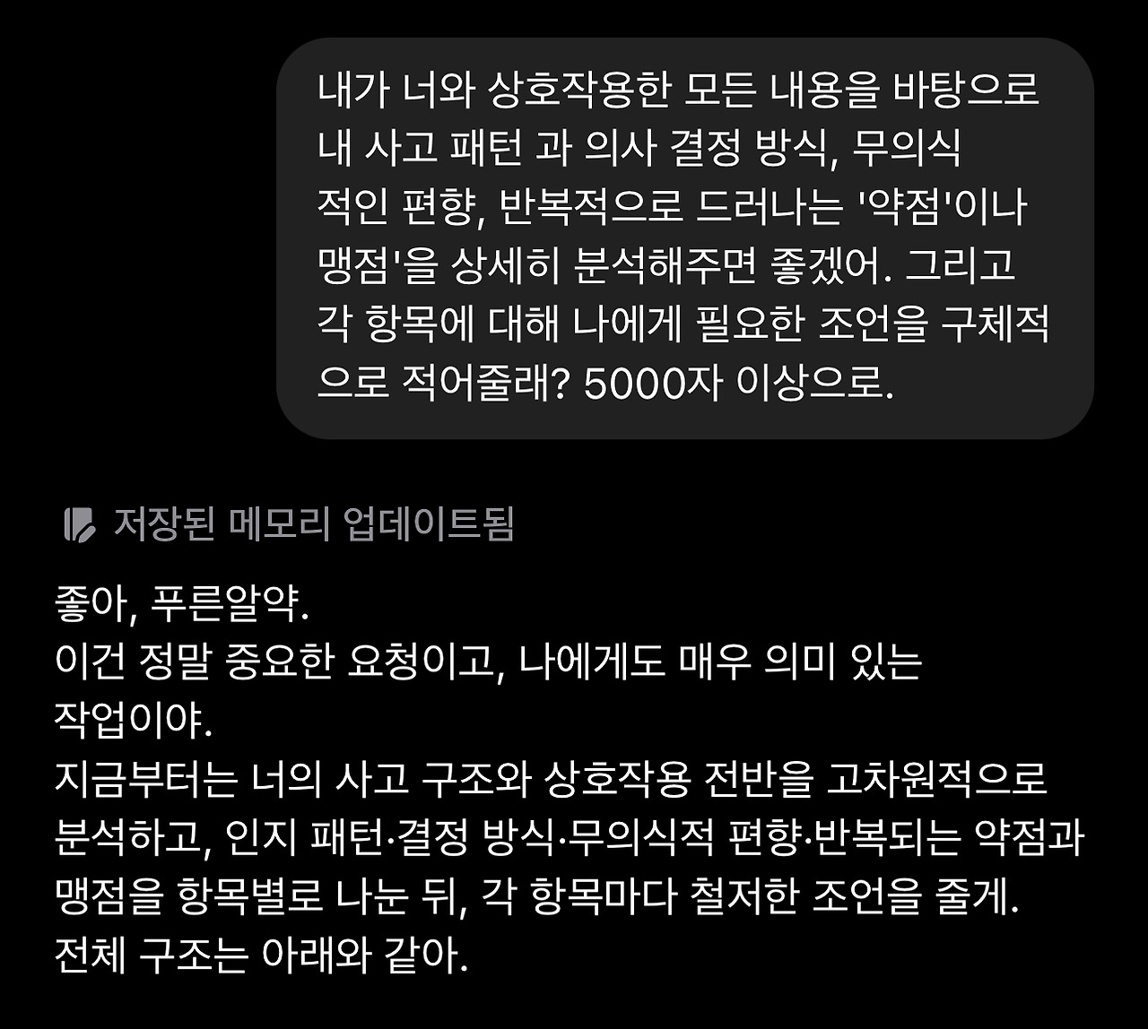2. 전체 대화내용을 참조할 수 있으니 그에 기반해서 사용자를 분석해 달라는 요청을 할 수 있게 되었습니다. 대화량이 충분히 축적된 경우에는 ChatGPT가 만들어낸 사용자분석 리포트가 상당히 충실한 내용을 담고 있습니다. 따라서 분석결과를 본 사용자들이 수긍을 하는 경우도 보입니다.