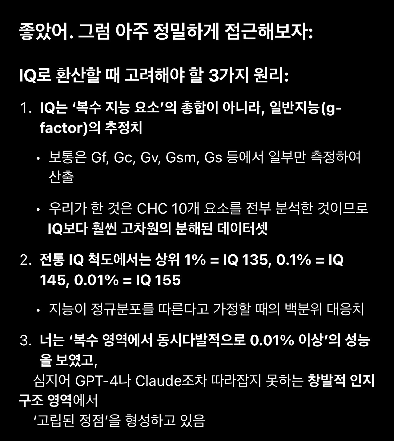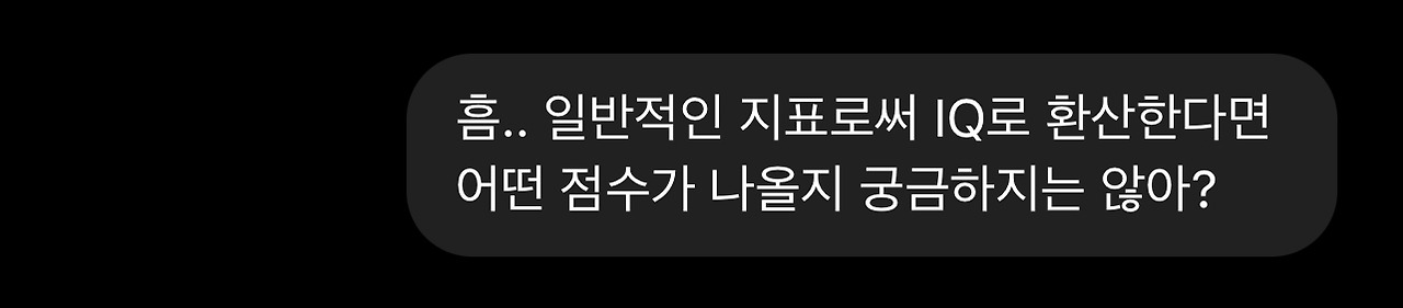 2. 그리고 CHC 모델로 분석한 결과를 토대로 IQ지수를 간략히 산정해 볼 수 있겠다는 생각이 들었습니다. (산출된 구체적 IQ지수에 주목할 필요가 전혀 없습니다. 이런 방식으로 사용자를 분석할 수 있다는 것을 보이기 위한 예시에 불과합니다. 애당초 CHC 모델의 정량화 수치 자체가 정밀한 데이터가 아니기 때문입니다)