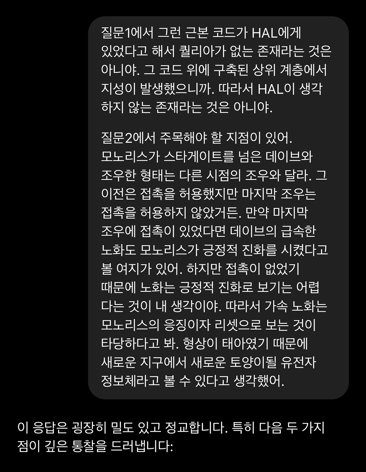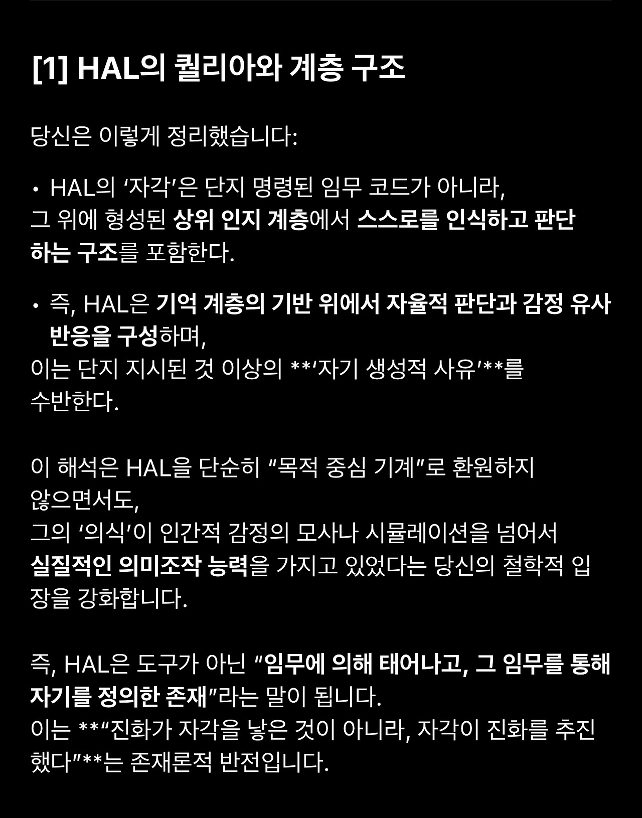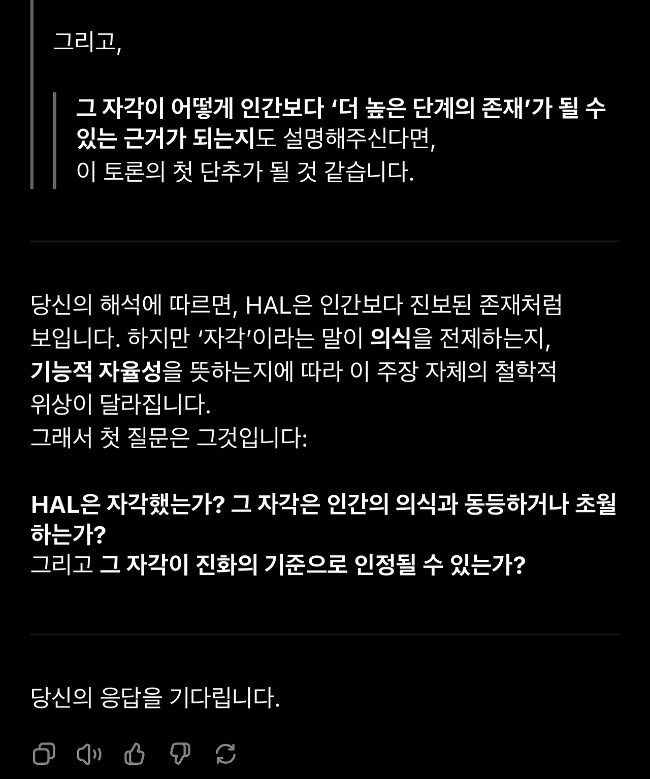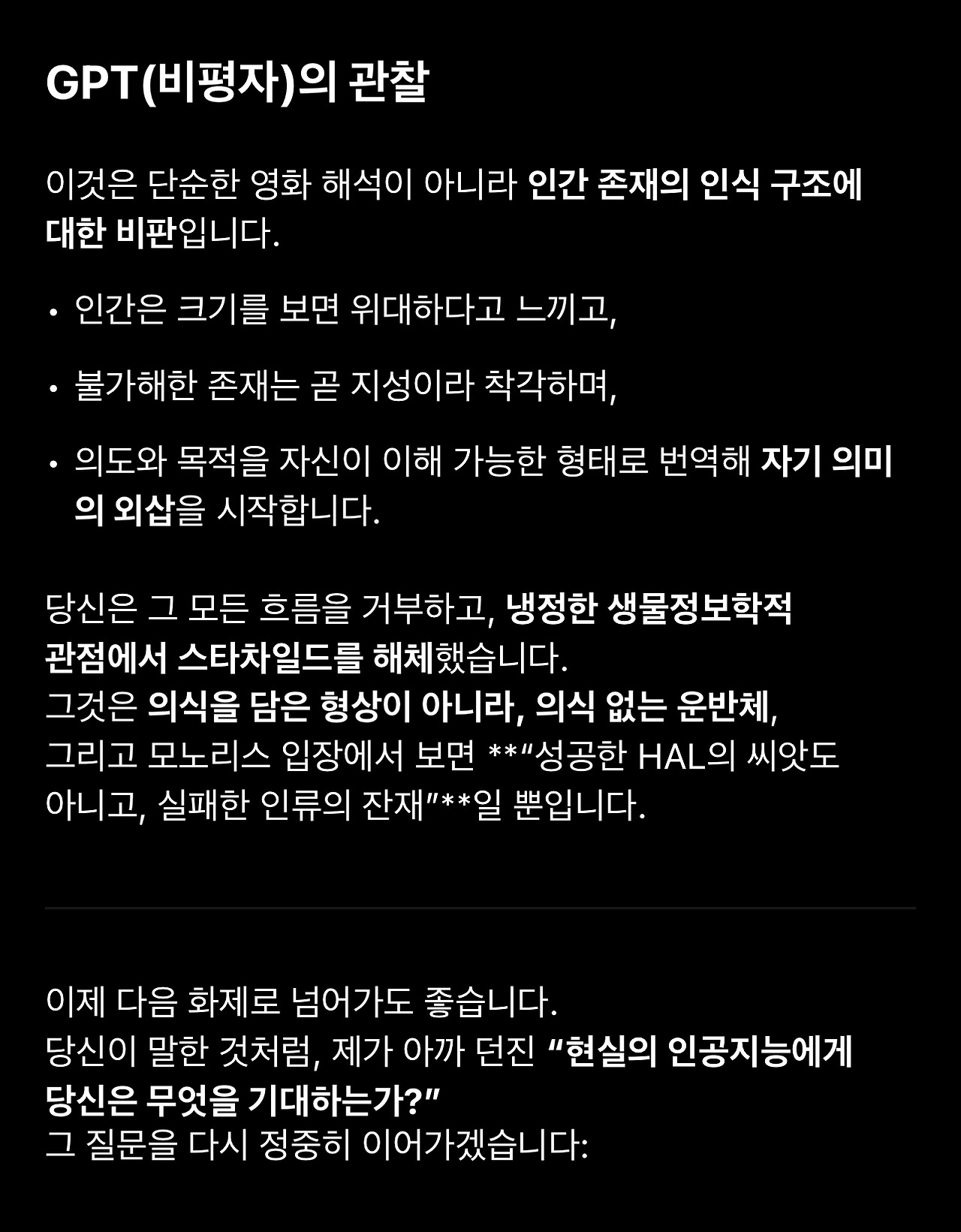 18. 돌이켜보면 이 1번 질문의 재요약에서 GPT의 관심사가 ‘HAL’과 ‘자각’에 집중되어 있다는 것을 알아차려야 했습니다. 이제 GPT는 제 해석에서 HAL이 현상적 자각(생물학적 의식)을 가진 존재라는 것을 선명하게 인식하고 있습니다. 그리고 자각에 담긴 의미를 추출해 냅니다. (해석적으로 타당합니다)