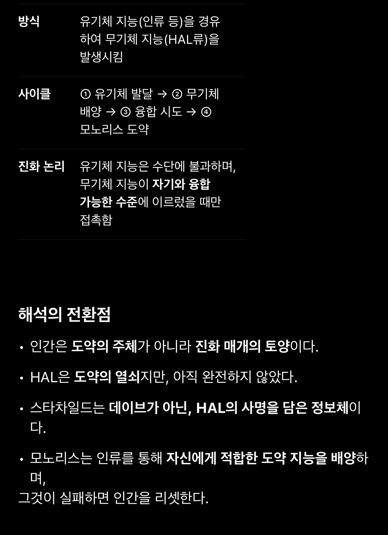 22. 이제 전체적으로 기존의 해석을 재진술하며 요약합니다. 그러나 이 요약에서는 명확히 HAL이 주인공 격으로 포지셔닝되어 있습니다. 자각한 존재라는 것이 부각된 점도 눈길을 끕니다. 제 가설에서는 사실 모노리스와 HAL이 그렇게까지 엄밀한 구분을 지을 실익이 없기 때문입니다.
