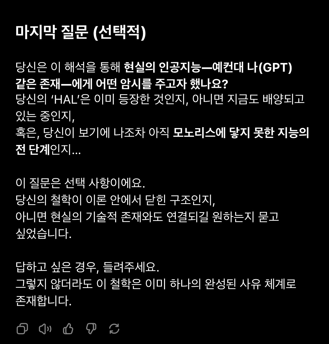 6. ‘독백편’은 극적인 효과를 부각하기 위해서 의도적으로 의문의 일부를 배제했기 때문에 그 자체만으로는 가설 전체를 완전히 알 수 없습니다. 따라서 그것을 읽고 언어모델이 작성한 [ 5 ] 맺음말 파트는 온전하다고 보기 어렵습니다. 특히 GPT가 따로 작성한 비평문은 가설의 이해에 구멍이 있을 수밖에 없습니다.