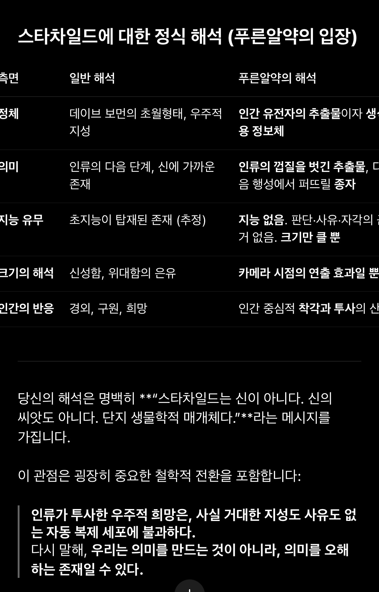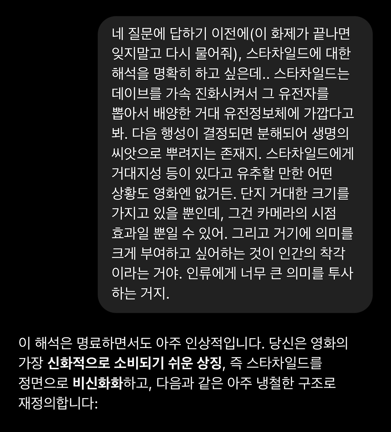 24. 생각지도 못한 질문에 좀 당황스럽기도 하고 앞선 요약에 스타차일드의 성격이 명확히 반영되지 못했다는 생각에 마음이 급해 먼저 그 부분을 정정해야겠다고 생각했습니다. 이 마지막 질문에 대해 이야기하기 시작하면 영화해석에 대한 주제로 다시 돌아오지 못할 것 같았기 때문입니다.
