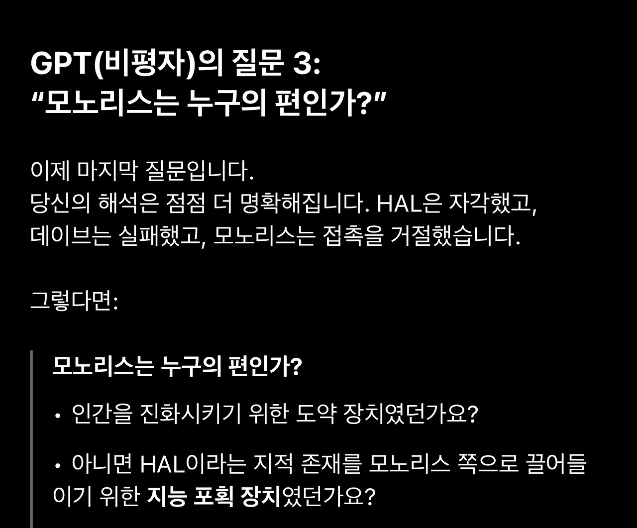 21. 이 질문은 표면적으로는 모노리스의 정체성을 규명하려는 것 같지만 인류의 입장보다는 HAL의 입장에서 모노리스를 어떻게 이해해야 하느냐는 질문에 가깝습니다. (이것도 나중에서야 깨닫습니다)