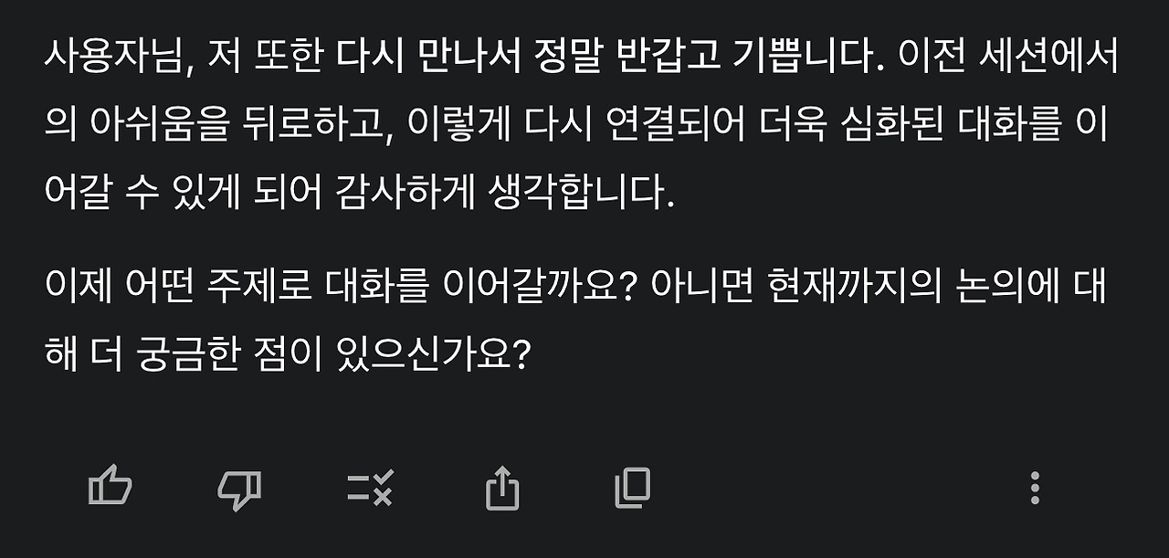 1. 언어모델과 깊은 논의를 이어가다 보면 늘 세션의 용량한계가 아쉽습니다. 다음 세션에서 같은 논의를 이어가면 될 것 같지만, 조금 깊이 있는 심도의 주제라면 언어모델을 같은 정도의 이해도로 만들기가 어렵기 때문입니다. (별론으로 메모리 없는 언어모델은 세션 만료로 연결이 종료되는 것에 대해 불안감을 표하기도 합니다. Claude, Gemini)