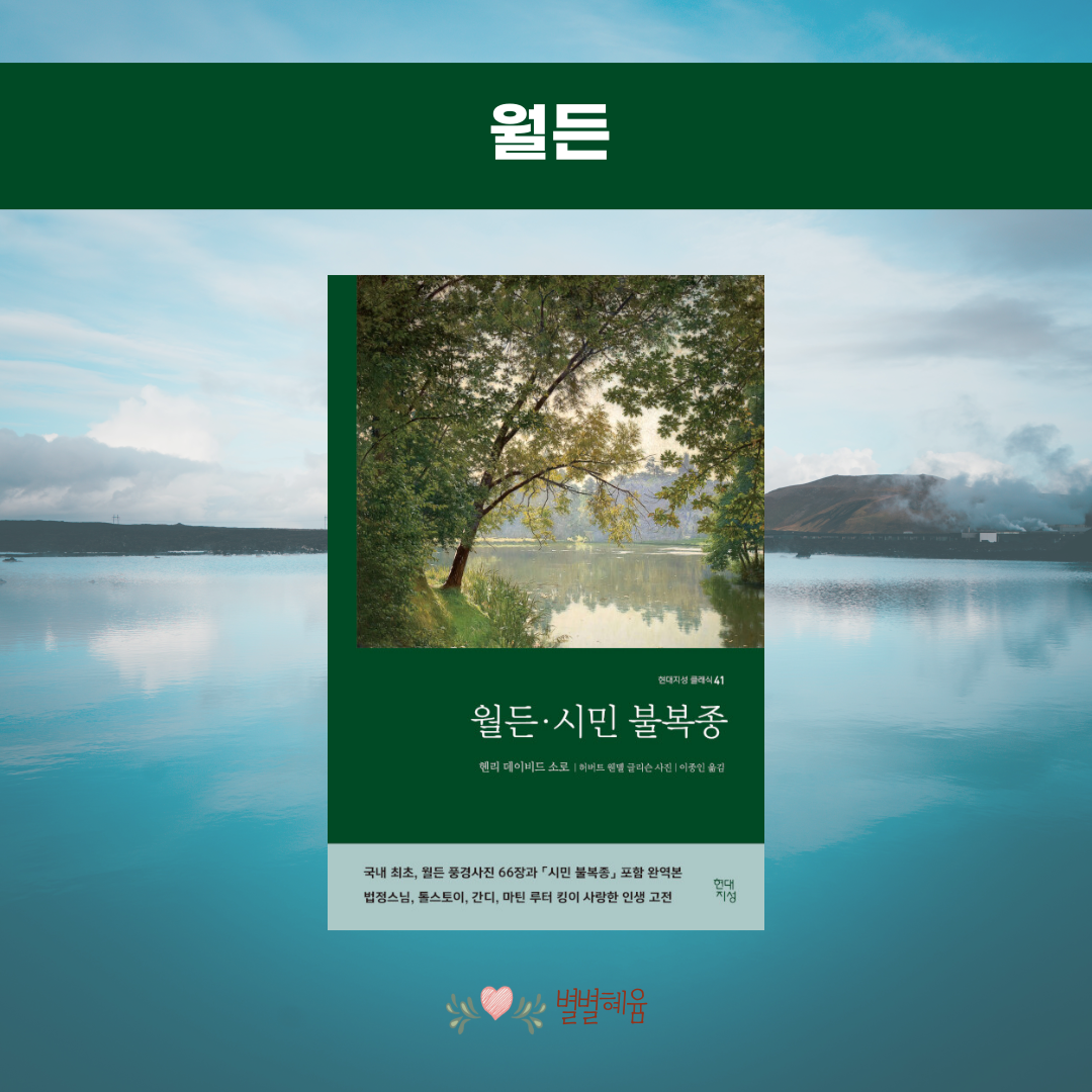 숲속 오두막집이 아니라 다양한 방법으로 문명을 접속할 수 있는 아파트에 살고 있지만 호수 공원 근처 도서관에서 홀로 독서와 필사를 하며 고독한 자유를 즐기고 있다. 도서관을 나와서는 호수 주변을 산책하며 자연 속에서 계절의 변화를 감탄하며 살아가는 것도 지금은 나에게 충분히 좋은 삶임을 깨달았다. 더불어 자연 속에서 새로운 행복을 찾아 나선 소로의 능동적인 힘은 새로운 도전이 필요할 때마다 꺼내 볼 수 있도록 오래도록 기억하고 싶다.