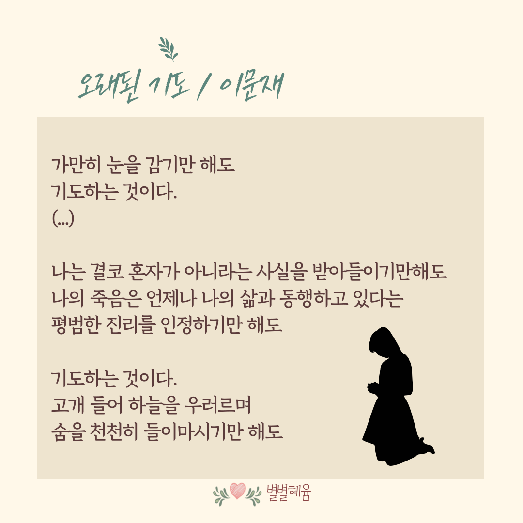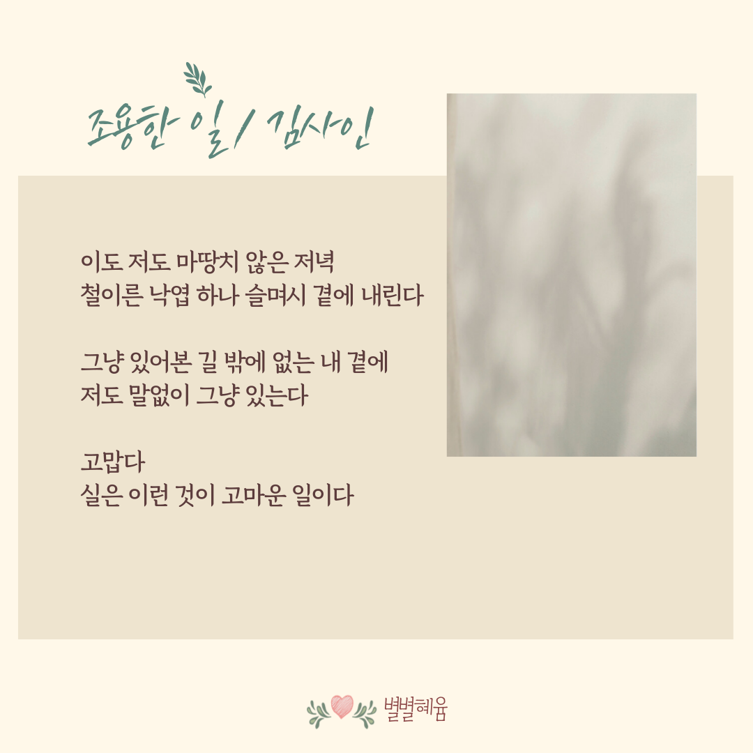 한 주 동안 여러 시를 읽으며 감동하다 보니, 자연스레 ‘시인 예찬문’이 되었다. 결국 시인은 사람과 자연을 재료로 삼아, 정제된 언어와 섬세한 묘사라는 도구로, 인생이라는 음식을 ‘시’라는 그릇에 담아 우리에게 건네고 있었다. 시인이 요리한 인생에서 삶의 진미를 발견하며, 내 인생을 음미하고 싶다. 더 천천히 다정하게.