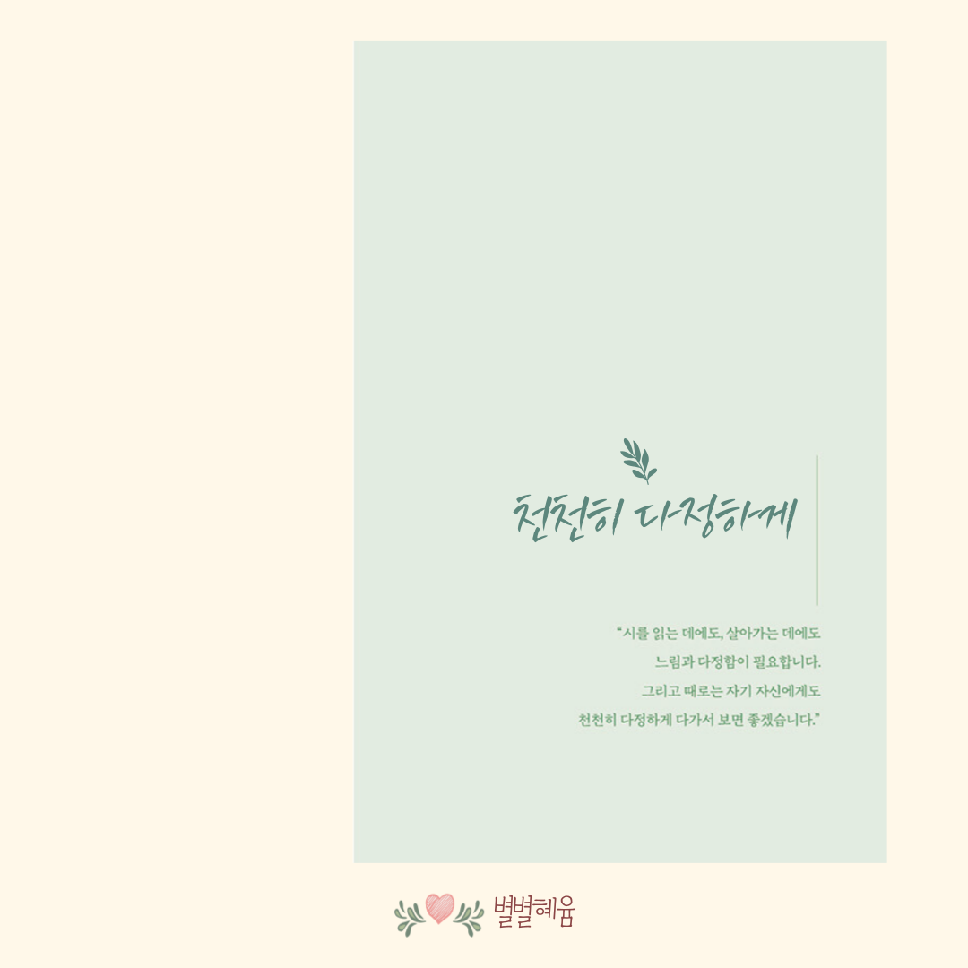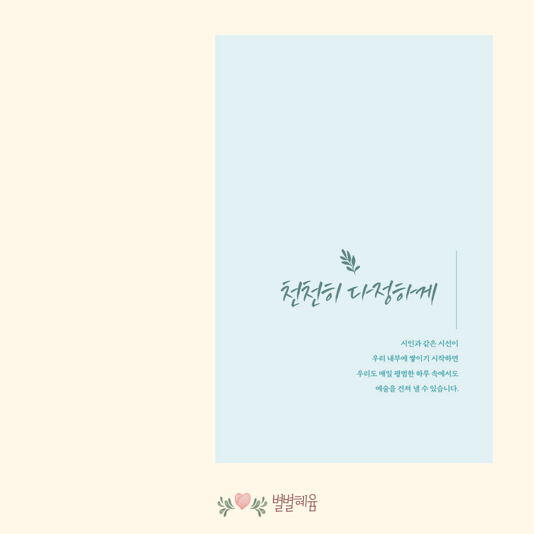 우리나라를 대표하는 카피라이터인 저자가 사랑하는 시는 어떤 모습일까 궁금해하면서 첫 페이지를 펼쳤다. 저자는 김사인 시인의 말을 빌려 시는 글자로 읽는 것이 아니라 내 몸 크기로 일으켜 세워야 한다고 말한다. 종이 위의 시를 ‘등신대’처럼 세우듯 내 감정을 시 안으로 밀어 넣어 읽으니, 시는 이전과 전혀 다른 모습으로 다가왔다. 책 제목처럼, 시는 천천히, 그리고 다정하게 내 안으로 스며들었다.