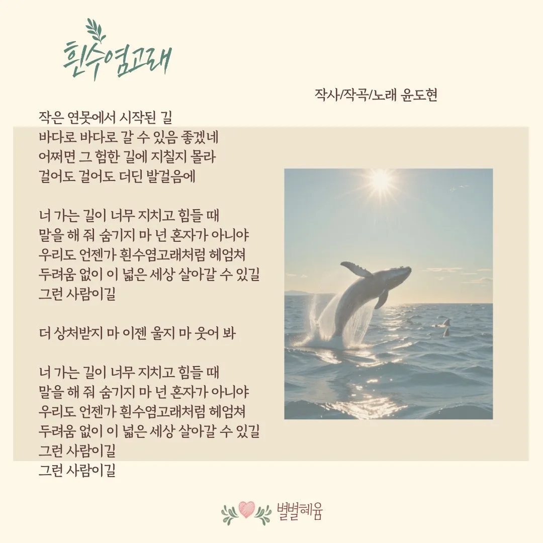 이 곡은 세상에서 가장 큰 동물인 흰수염고래(대왕고래)에서 영감을 얻었다고 한다. 흰수염고래는 축구장의 3분의 1에 달하는 거대한 몸집을 지녔지만 성격은 온순하다. 거친 바다를 묵묵히, 그러나 당당하게 자신의 속도로 헤엄쳐 나간다. 그 모습은 마치 우리에게 말하는 듯하다. 두려워도 괜찮다고, 지쳐도 괜찮다고. 그래도 너는 이미 충분히 크고 단단하다고.