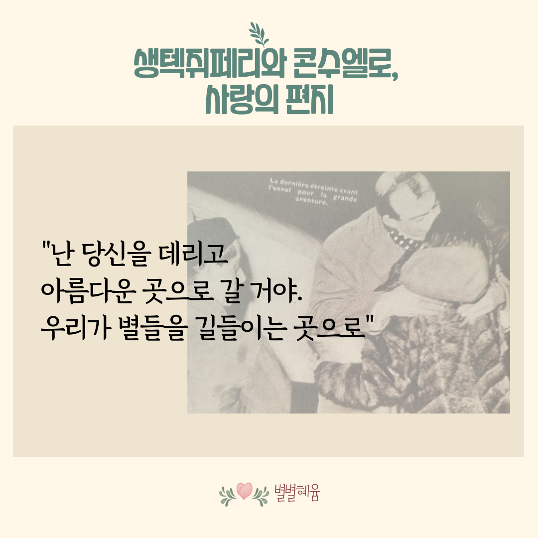 가시가 네 개가 달린 도도한 장미, 콘수엘로는 생텍쥐페리가 다른 장미에 눈길을 줄 때도 눈감아 주면서 작은 행성에서 기다리고 있었습니다. 그녀는 생텍쥐페리가 어려움을 겪을 때마다 그를 지지해 주었고 그도 콘수엘로를 지켜주었습니다. <어린 왕자>의 마지막 장에서 어린 왕자가 한 말은 생텍쥐페리가 콘수엘로에게 한 말이었습니다.
