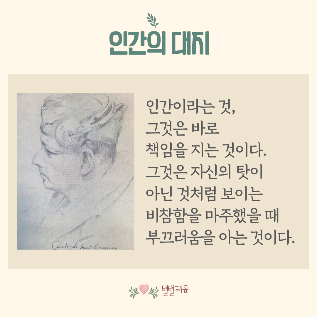생텍쥐페리가 기체결함으로 리비아 사막에 불시착하여 5일 만에 구조되는 경험을 바탕으로, 자전적 소설인지 에세이인지 구분 짓기 어려운 <인간의 대지>가 완성됩니다. <인간의 대지>는 <어린 왕자>의 모티브가 된 작품으로 <어린 왕자>에서 등장하는 배경과 사상, 주인공과 키워드를 모두 발견할 수 있습니다.