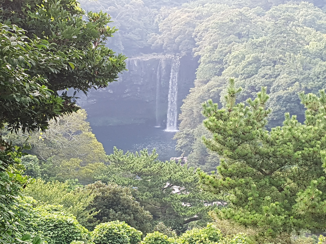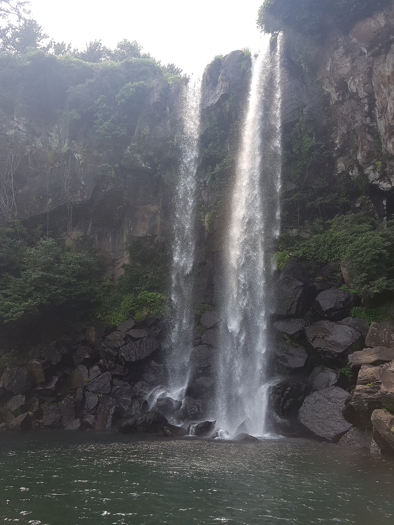 바다 바로 앞에 있는 정방폭포. 검은 절벽에서 쏟아지는 흰 물줄기가 깊은 못을 이루며 바다로 흘러들어갔다. 폭포를 바라보면 깊은 정글 같은데 뒤를 돌아보면 망망대해가 펼쳐져 있어 믿기지 않아 몇번이나 고개를 돌려가며 바라봤다. 폭포수의 시원함에 흠뻑 빠져 풍경을 구경하다가 천지연 폭포도 얼른 보고싶어 일어섰다.