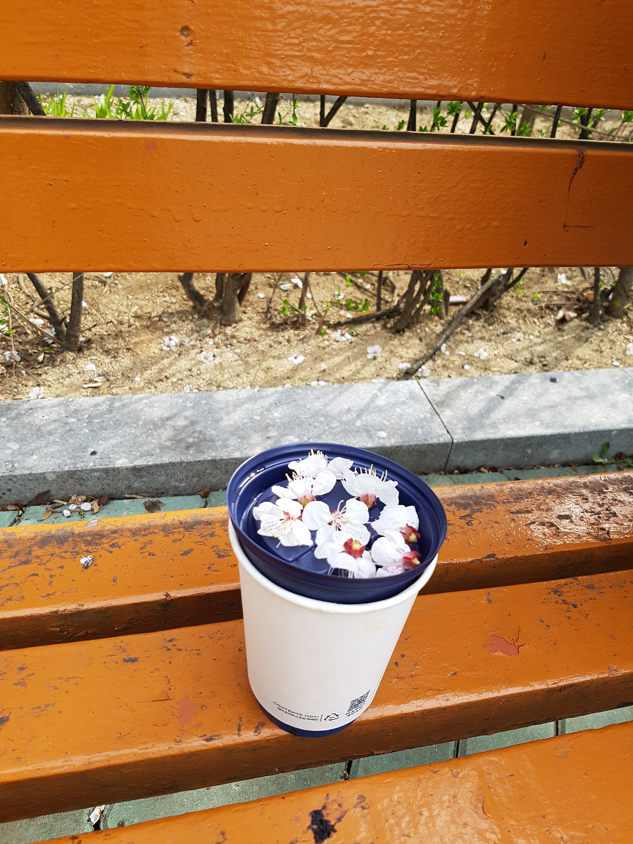 그냥 멍만 때리다 오는 게 전부일 뿐이지만 집에 돌아와 보면 꽃잎들 너대섯 녀석은 꼭 내 몸 어딘가에 숨어서 따라 들어오곤 한다. 평상시 같았으면 쓰리기 통에 버리고도 남았지만 오늘은 그들에게 자리를 마련해주었다. 유리잔에 물을 채우고 꽃잎들을 떼어서 조심스레 넣어 주었다. 작은 벚꽃 한그루가 들어와 앉아있는 것 같다. 그냥 바라만 보려고 했는데 나도 모르게 향기를 얻으려 코를 박고 킁킁거려보기도 하고, 손으로 콕콕 찔러도 보고, 입김으로 후후 불어서 빙글빙글 돌려도 보았다. 귀찮게 구는 나에게 대접이 뭐 이러냐고 그만하라듯이 가운데로 모여서 지들끼리 몸을 맞대고 꼼짝을 안 한다. 아마도 나에게 투덜거리고 있는지도 모른다.