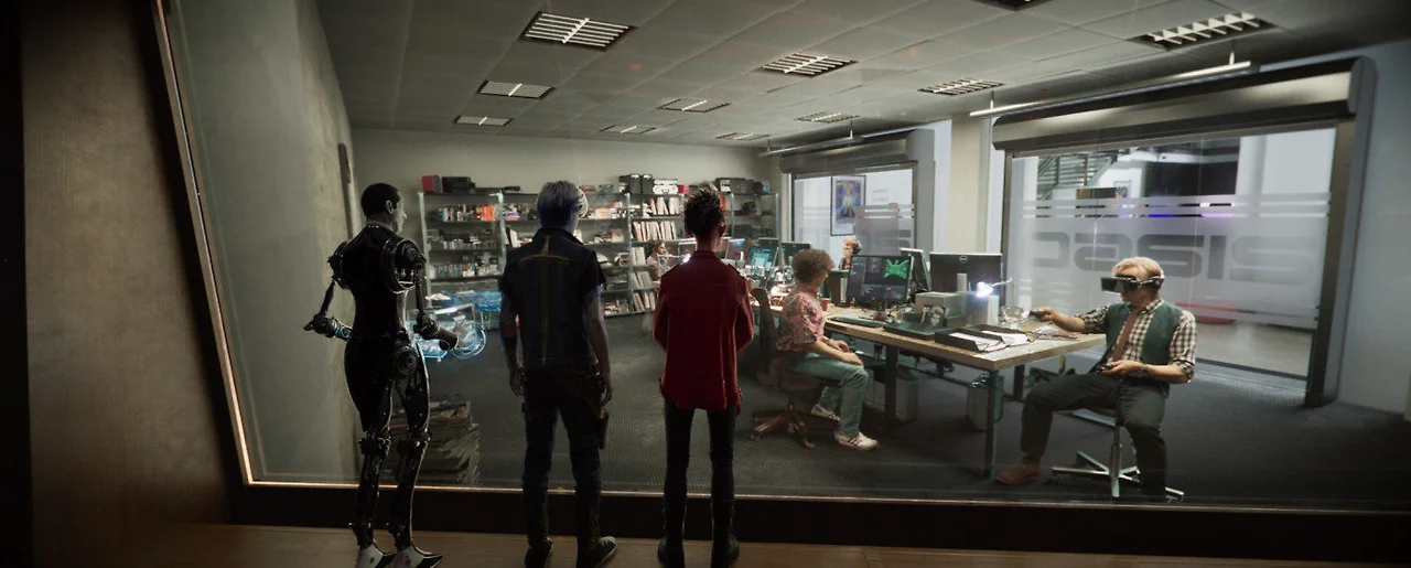 '레디 플레이어 원'은 '최초의 가상 현실 블록버스터'라는 홍보 문구처럼, 영화의 대부분이 '오아시스'라는 가상 현실 속에서 진행된다. 이 오아시스를 만든 '제임스 할리데이'(마크 라이런스 역)가 사망하면서, 오아시스에서 세 개의 열쇠를 찾고 최종 이스트 에그를 발견한 사람에게 오아시스의 전권과 5000억 달러의 유산을 넘기겠다고 유언으로 발표한다. 그리고 이 비밀을 풀기 위한 오아시스의 유저들과, 회사를 차지하기 위한 악당 기업 IOI의 경쟁이 시작된다. 마치 게임 스테이지와도 같은 이 시놉시스를 클리어하기 위해, 파시발(타이 쉐리던 역)은 자신의 파티원들인 H(리나 웨이스), 다이토(모리사키 윈 역), 쇼(필립 조 역), 그리고 아르테미스(올리비아 쿡 역)와 힘을 합친다.