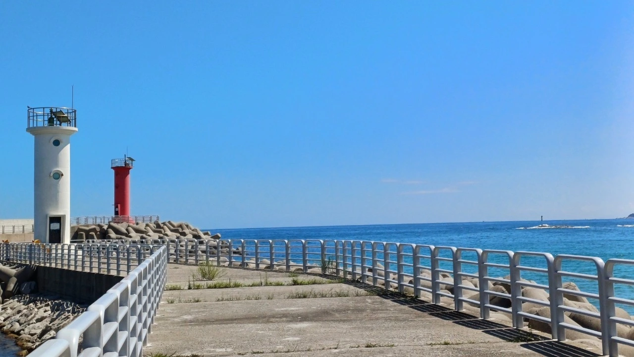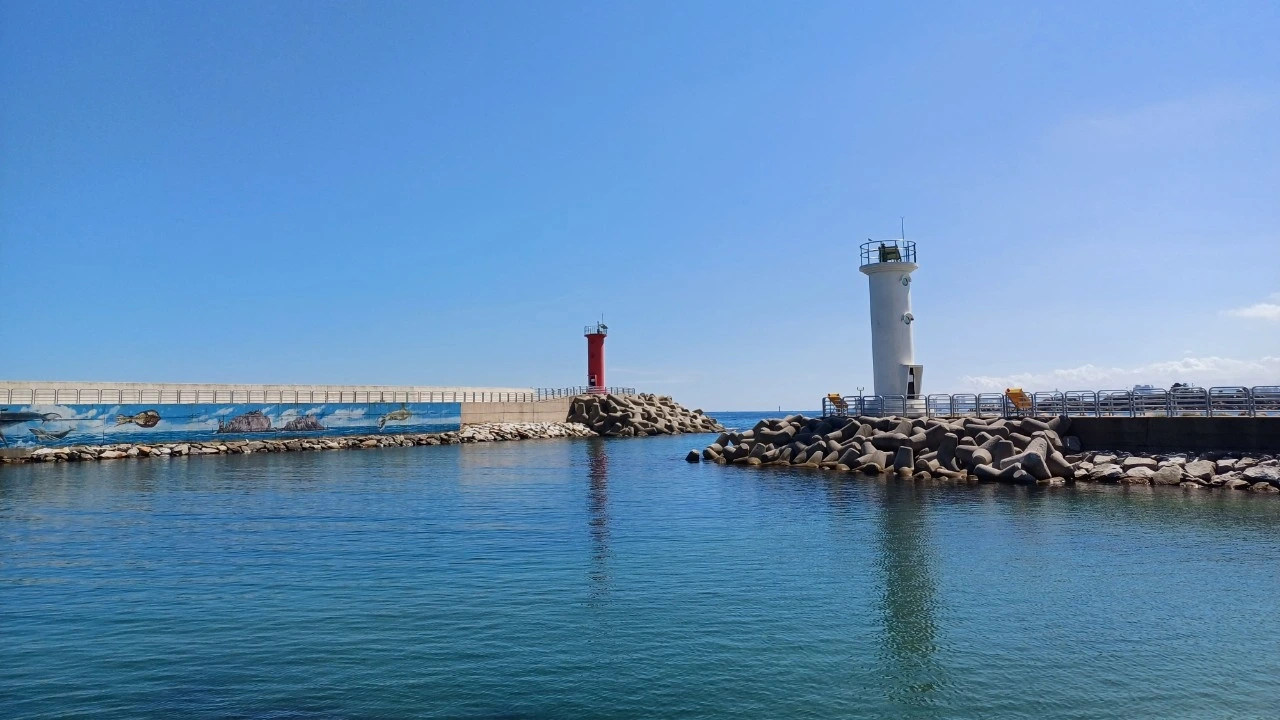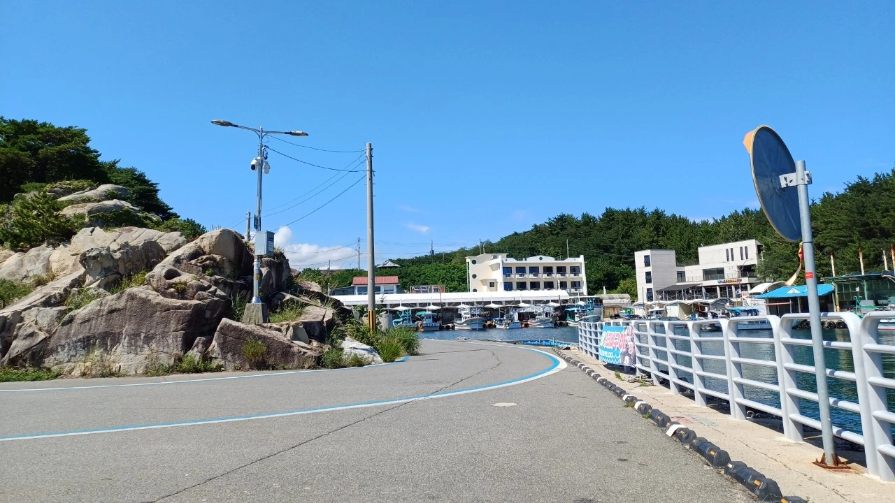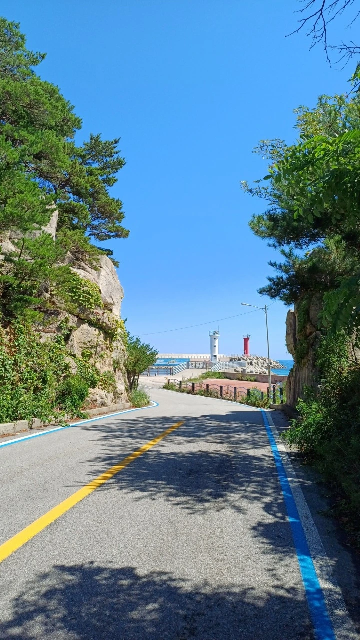 백도 해수욕장에서 백도항으로 가는 길에 도로 사이로 보이는 빨간색 등대와 하얀색 등대의 모습이 보이는데 한 폭의 수채화처럼 예쁘다.