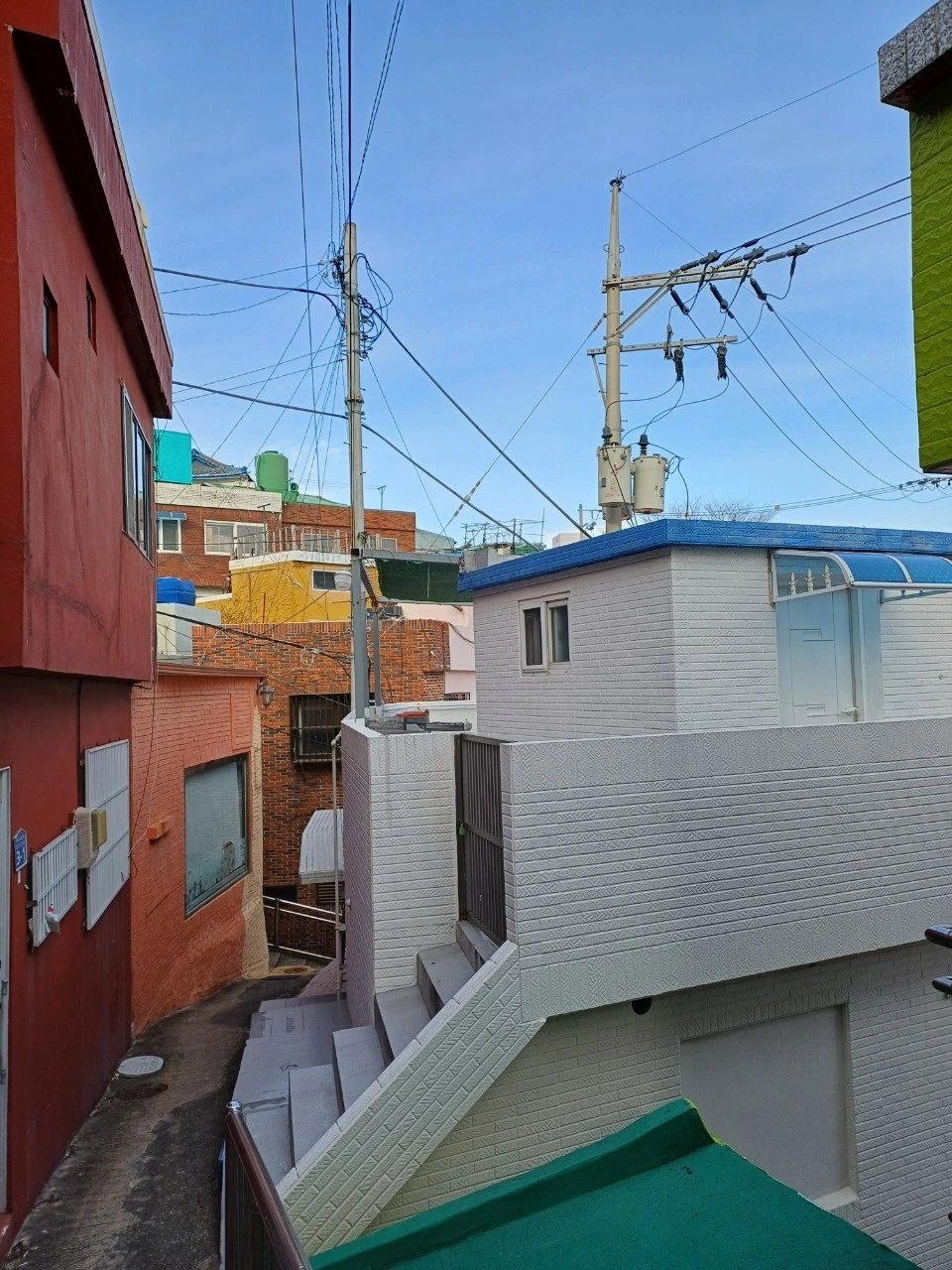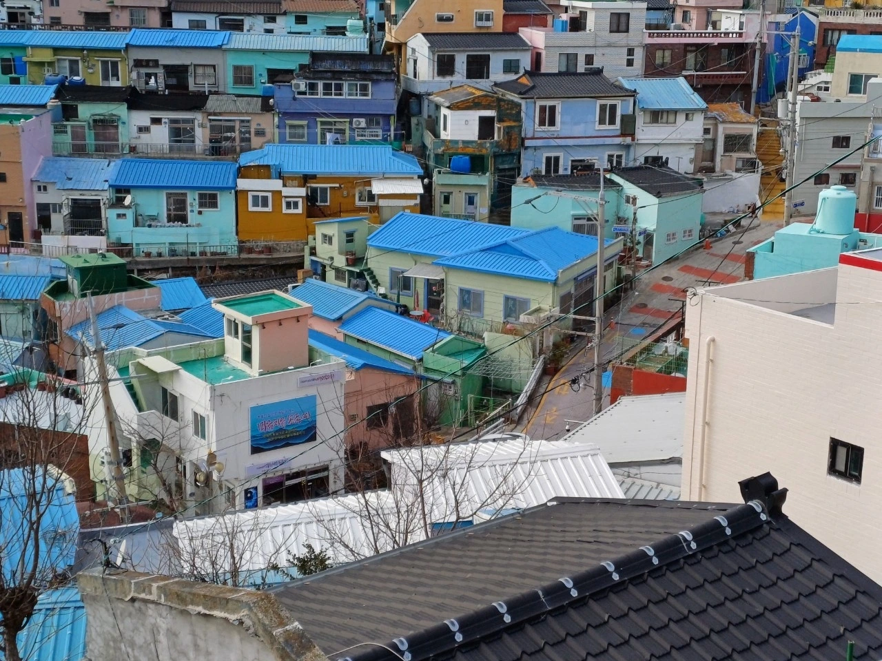 마을 꼭대기에서 내려다보면 감천마을의 색색의 지붕과 부산항이 어우러지는 멋진 전경을 감상할 수 있다.