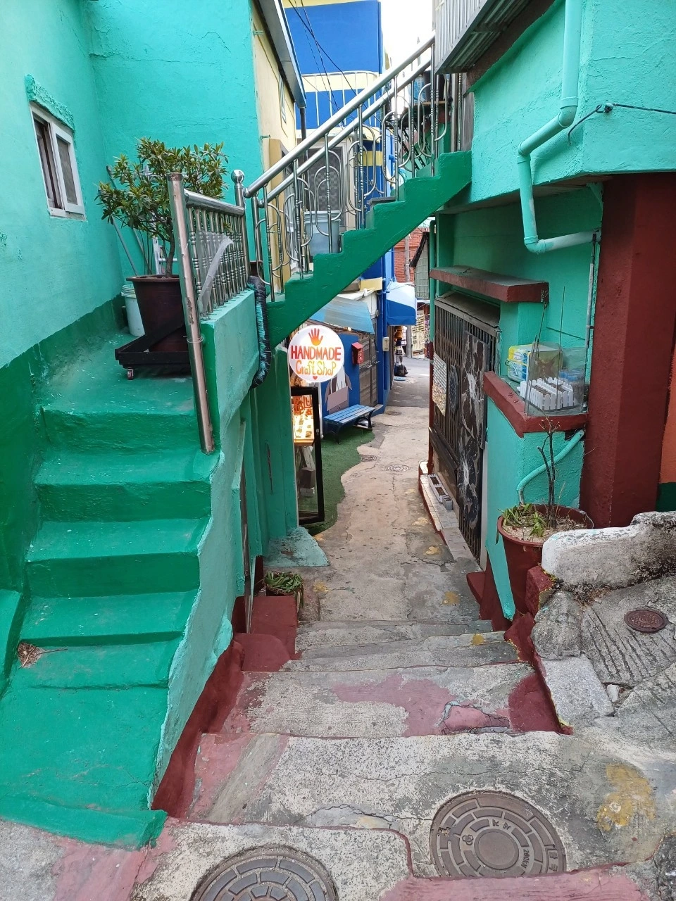 좁고 구불구불한 골목길이 감천마을의 매력 포인트 중 하나이다. 길을 따라 걷다 보면 벽화, 조형물, 아기자기한 카페와 상점들을 만날 수 있어 산책하는 재미가 있는 골목이다.