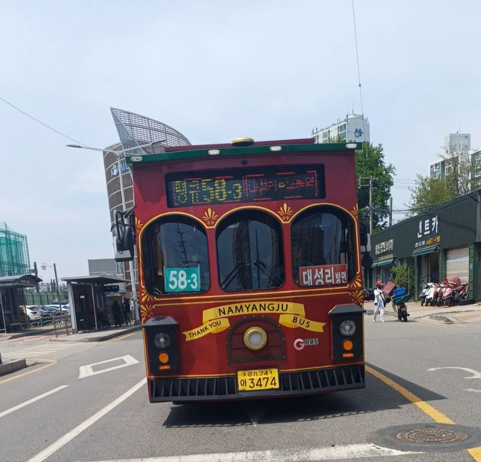 버스가 왔다. 예쁘다. 유럽에서나 봄직한 버스다. 차 안에서는 '어디쯤 가고 있을까'라는 노래가 흘러나왔다.
