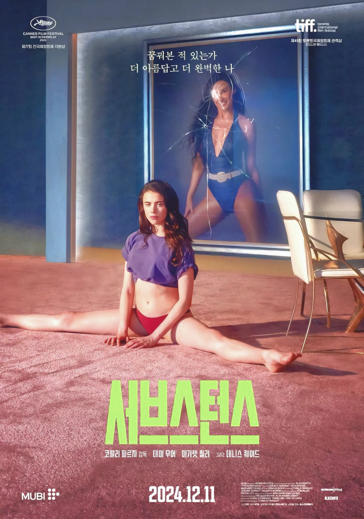 이 영화에 대한 감상을 나누면 가장 하기 쉬운 질문. 너라면 '서브스턴스'를 경험하겠느냐, 하는 것. 나는 영화를 보는 내내 아니라고 생각했다. 저걸 시작하는 순간 나는 매 순간 죽고 싶을 것 같았으니까. 언급했듯 그 모습을 너무 사랑하게 되면 반대의 나를 깊이 혐오할 수밖에 없으니. 그리고 이걸 인식하고 있는 걸 내심 자랑스레 생각했던 것 같다.