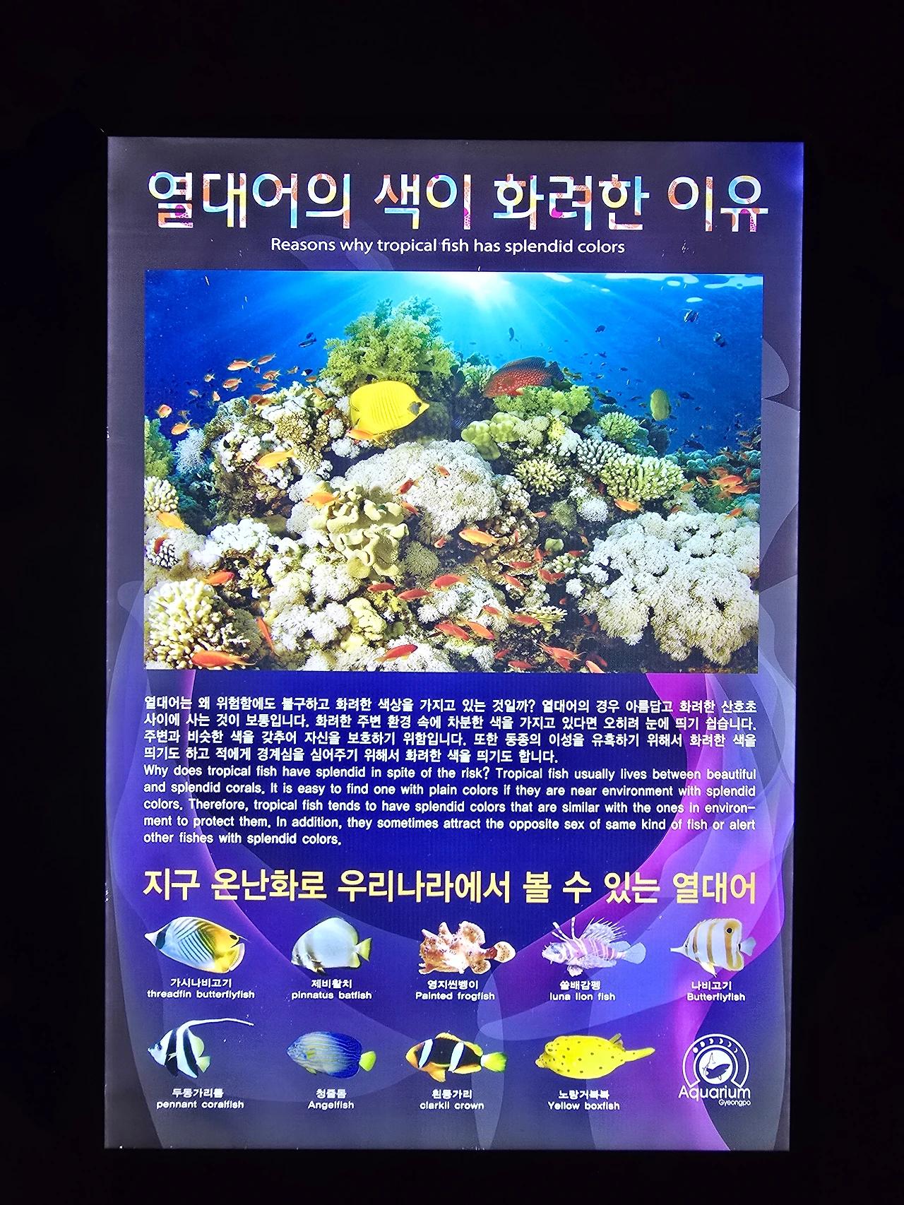 코처럼 생긴 게 튀어나와 있길래 쟤 이름은 왕코물고기일까, 했더니 설명에는 유니콘 같은 뿔을 가진 유니콘 피시라고 되어 있었다. 유니콘 피시요? 미안한데 유니콘은 너보다는 좀 예쁜 애들한테 어울릴 것 같은데. 그런 생각을 하는 내 앞으로, 무슨 맨홀 뚜껑으로 안면부를 맞은 것 같은 형태의 물고기가 지나갔다. 아니네, 얜 더 하네. 그래. 유니콘이 꼭 무지개색 갈기에 보라색이나 핑크색의 예쁜 친구들이어야 할 필요는 없지. 이런 애도 있잖아. 얜 이름이 뭐야, 심해왕망둥어? 했더니 나폴레옹 물고기였다.