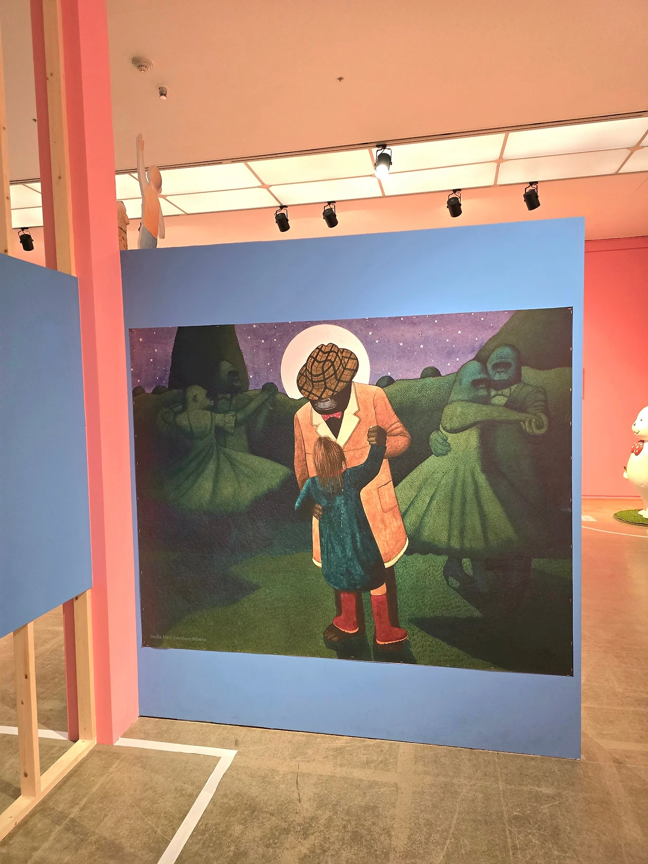고릴라 소녀.. 아니. 그 고릴라 책의 주인공인 한나가 고릴라가 한밤중에 고릴라 커플들을 배경으로 왕큰 고릴라와 함께 춤을 추는 그림이 걸려 있었다. 그걸 보고 울 뻔했는데 울진 않았다. 울 정도는 아니었나봐. 거기 내 또래 직원이 지겨워 죽겠다는 표정으로 거울을 계속 쳐다보고 있던 탓에 좀 남사스러워 그랬을지도 모른다. 신기한 일이었다. 그 책은 주인공 한나가 무뚝뚝한 아빠 말고 선물받은 고릴라 인형의 확장 버전과 즐거운 시간을 보내는 내용이니까.