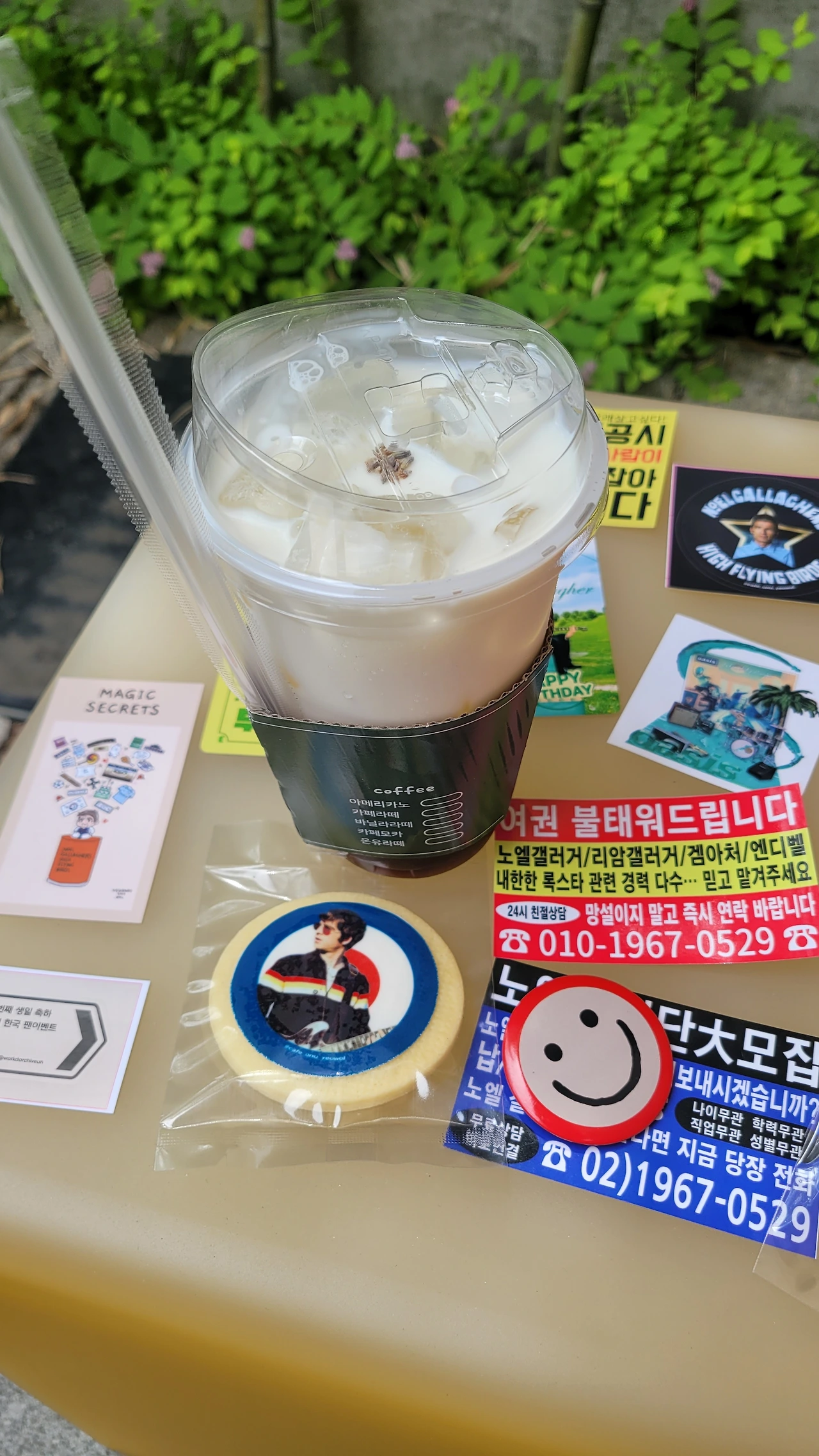 노엘이 마신다는 방식대로 만든 밀크티는 내 취향이 아니었다. 하지만 나는 커피를 마시러 간 게 아니잖아? 나는 이 공간을 향유하기 위해 왔다. 잠실 공연에서 그가 한국 팬에게 전달받아 내내 하고 있던 스마일 배지와 우습고 유치하고 귀여운 찌라시를 표방한 스티커와 그의 파란 눈을 강조해 앞뒤로 얼굴을 프린팅한 키링이 '나눔존'에 있었다.