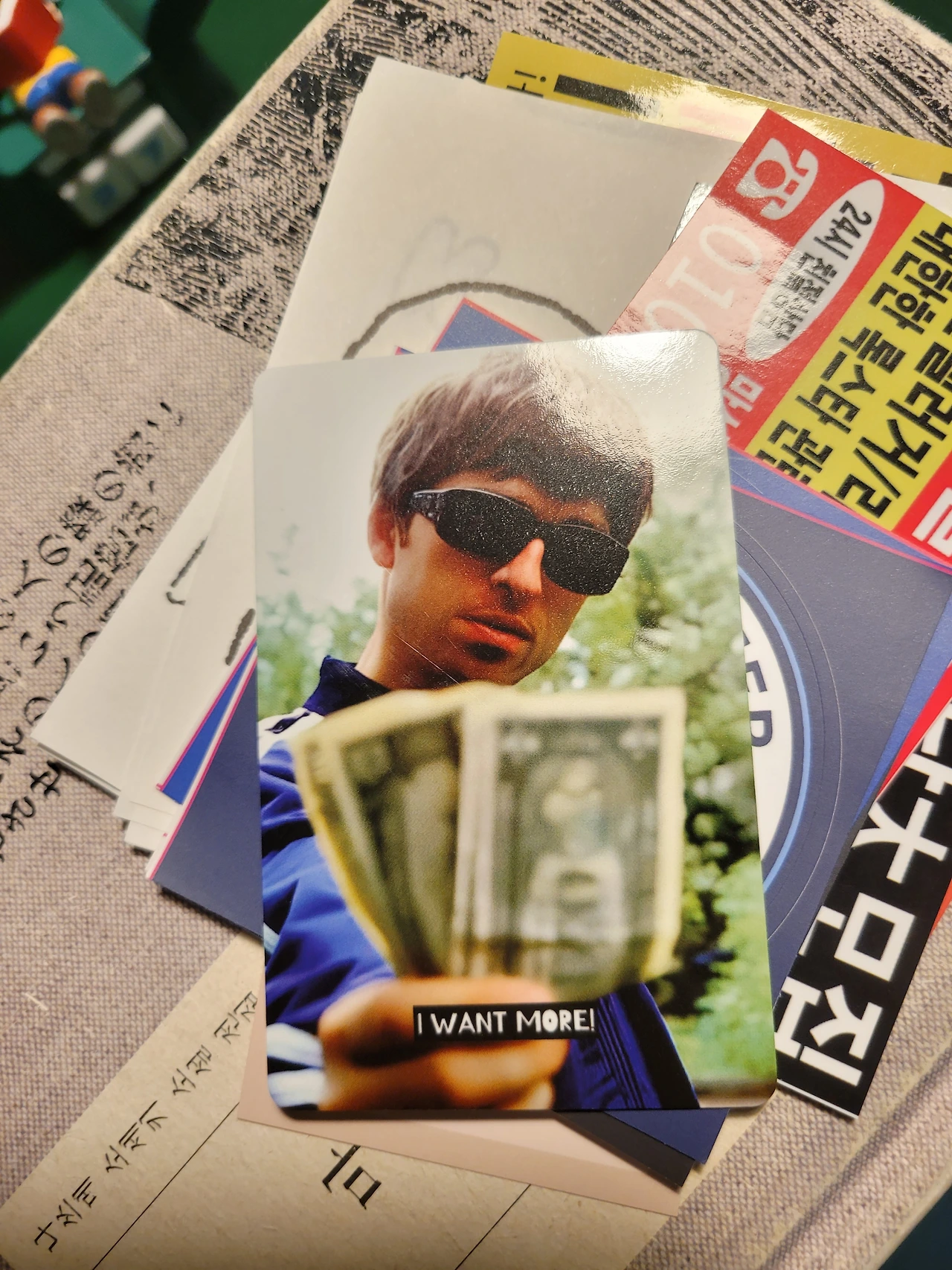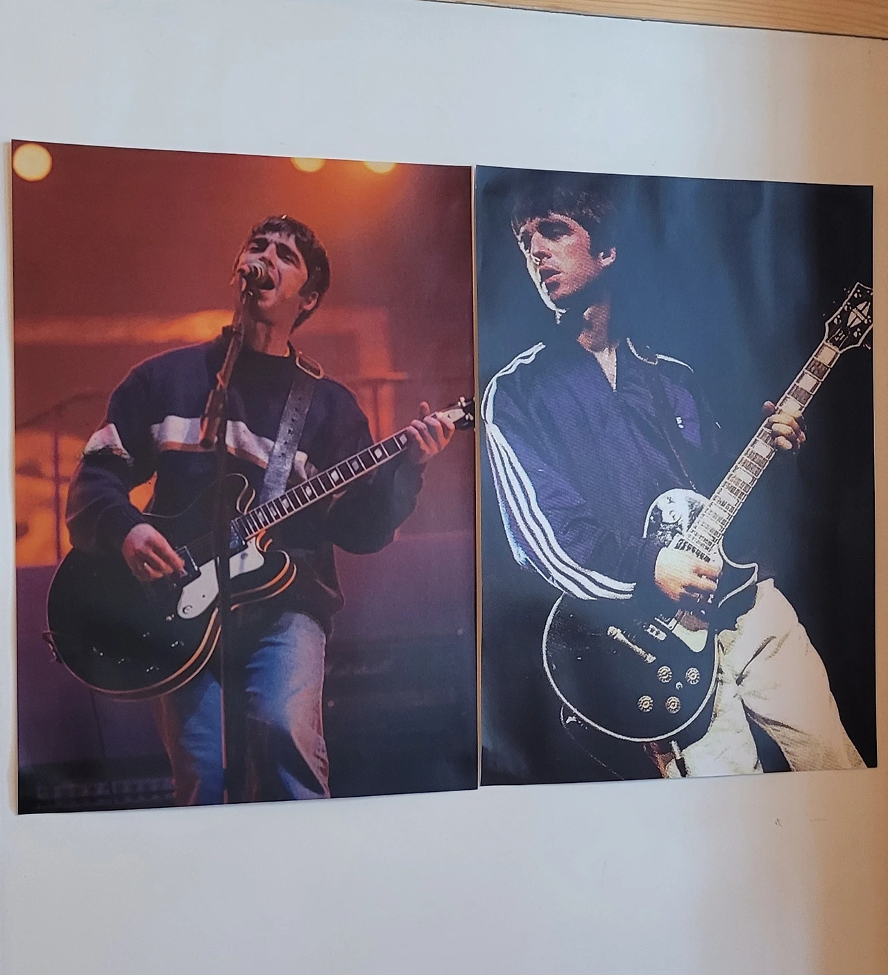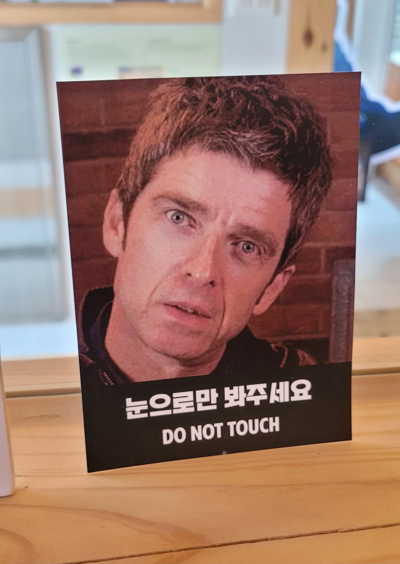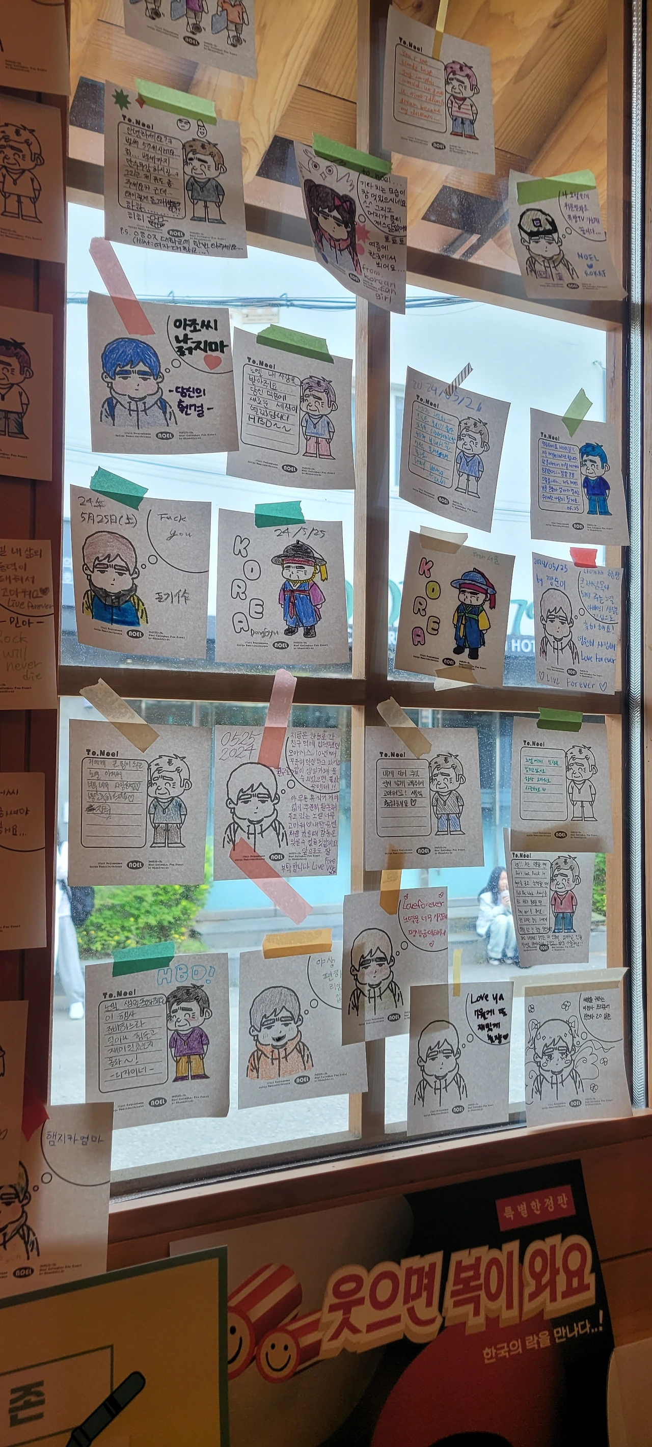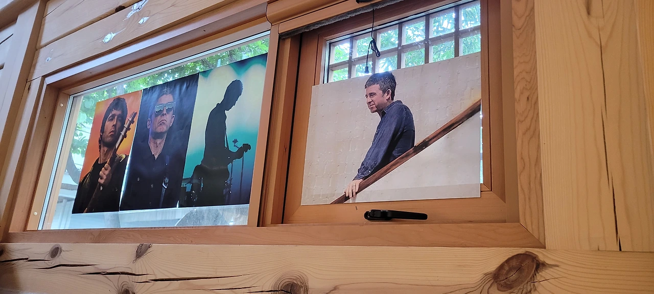 까칠해 보이는 얼굴을 클로즈업한 노엘, 파란 항공점퍼를 입고 팔짱을 끼고 턱을 슬쩍 든 노엘, 시선을 돌리고 에피폰 기타를 맨 노엘, GOD이라는 단어와 함께하는 노엘, 얼굴을 찌그러뜨려 환하게 웃는 노엘, 연하늘색의 맨시티 유니폼을 입은 노엘, 뚱한 표정으로 기타를 메고 까만 반팔을 입은 살이 좀 빠진 노엘, 작년에 내가 봤던 가죽점퍼의 조금 살찐 노엘.. 2층까지 모든 벽면이 그였다. 팬들 보는 눈은 다 똑같구나. 아, 저 날 옷 예쁘다고 생각했는데, 저 사진 레전드라고 생각했는데. 그랬는데. 여기 나 혼자 '그랬던' 그의 멋진 모습들이 한가득 펼쳐져 있었다.