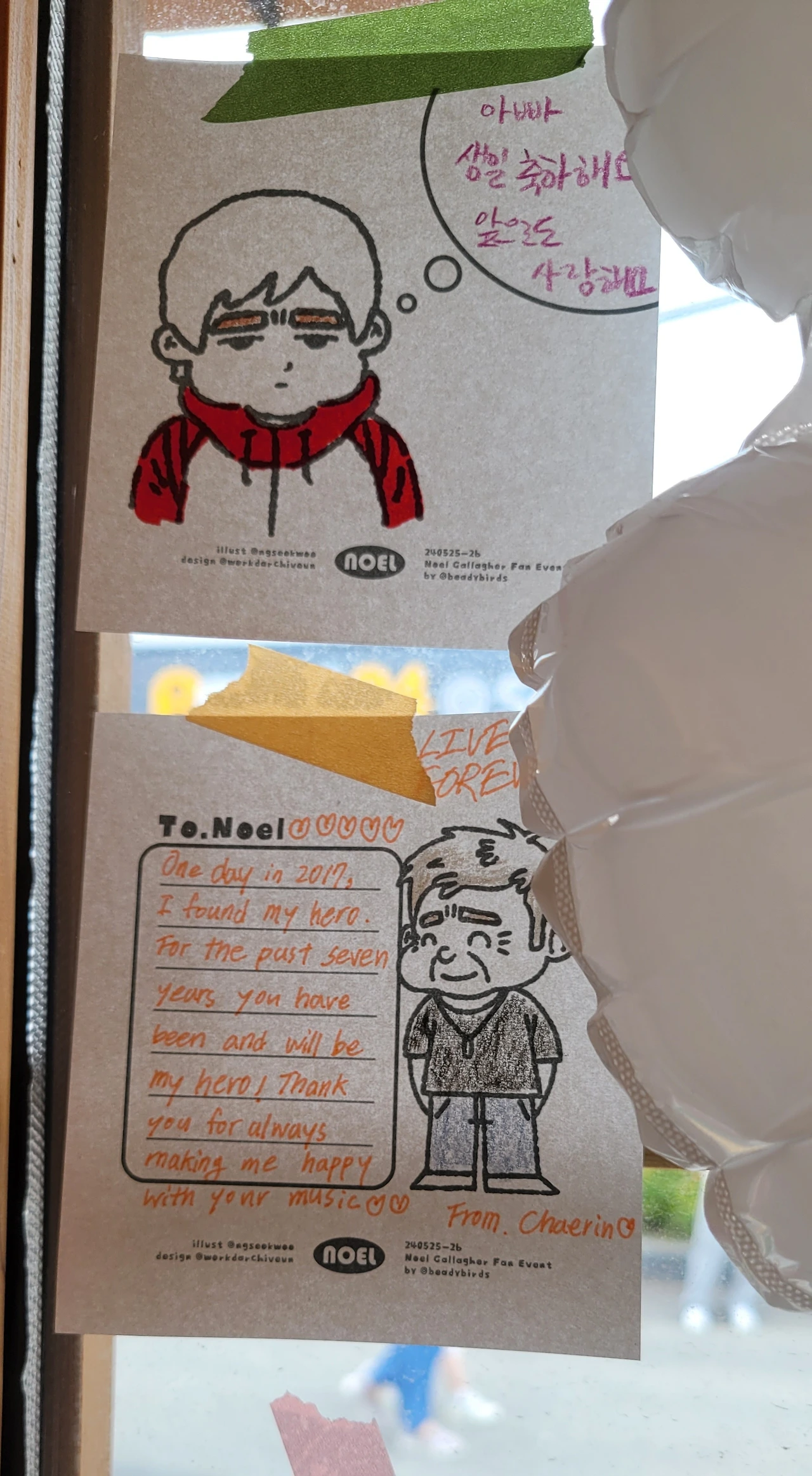 오아시스 1집 'Definitely maybe' 커버를 재현한 포토존에서 사진을 찍었다. 어차피 이런 곳에 오는 사람들 마음은 다 똑같으니 이해해 주시리라 생각하고 스탭 분께 사진을 부탁했다. 정말 아무렇게나 찍어 주셔도 된다고 말씀드렸으나 그분은 참 친절히, 열심히도 인증샷을 남겨 주셨다. 잔뜩 귀여운 캐릭터로 그려진 그가 찍힌 쪽지에 팬들이 써 놓은 메모들을 구경했다. 좋아하는 이유와 그 계기와 곳곳에 밝혀진 나이도 제각각이었으나 그 마음이 향한 곳은 똑같은 게 신기했다.