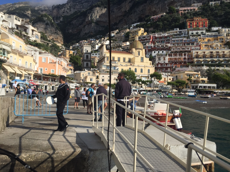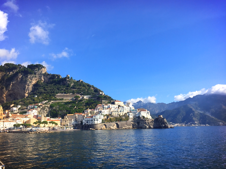 무사히 9시 55에 항구에 도착했다. 살레르노행 배를 기다리는 인파들 사이에서 숨을 헐떡이며 티켓 오피스에서 예약 내용을 보여주고 표를 받았다. 10월 중순의 태양은 여전히 강렬했고 땀이 주룩주룩 흘러내렸다. 이탈리아 남부라서 그런지 아직 날씨가 꽤 따듯하다. 페리는 시간에 맞춰 도착했고 10분 정도 더 기다리다가 포지타노 항을 출발했다. 살레르노까지 이동하는 동안 배 2층에 앉아서 아말피 해안의 아름다운 절벽과 마을의 풍경을 감상할 수 있었다. 잠시 마음에 평온이 찾아오면서 새벽에 일어나서부터 지금까지 개고생한 일들이 스쳐 지나갔다. 정말 옷 하나 두고 왔을 뿐인데 하필이면 바버 재킷이라 버리고 갈 수도 없는 노릇이었다. "하아.....**."