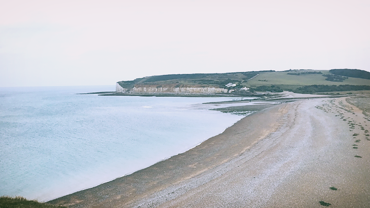 버스에서 내려 잠시 사진을 찍으며 쉬다가 세븐 시스터즈로 향하는 들판 길로 들어섰다. 수풀 내음이 진하게 베인 바람이 불어온다. 이렇게 드넓은 초원을 걸어온 적이 언제인가, 바다에서 불어오는 바람을 이기지 못하고 옆으로 휜 채 자라난 나무가 들판 위에 외로이 서 있는 모습이 문에 들어왔다. 세월의 풍파를 정면으로 맞았다는 말이 딱 어울린다. 그리고 들판 위에는 양 떼들도 있었는데 자유 방목 중이었다. 온종일 먹고 싸는 일 외엔 고민이 없어 보이는 양들이 부럽기도 하다. 지뢰밭처럼 깔린 완두콩 모양의 양 똥을 피하면서 계속 걸었다. 날씨도 살짝 흐린데다가 황량한 들판을 계속 걸으니 기분이 묘했다. 이곳은 아주 다른 세상인 것 같았다. 주변에 한국인 관광객들이 있다는 사실이 현실감을 되찾게 해주었다. 한참을 걸으니 자갈밭 길 너머로 바다가 나타났다. 그리고 일곱 자매의 첫 번째 언덕으로 오르는 길이 보였다. 나는 절벽에 올라가기 전, 한동안 자갈밭에 앉아서 바다를 바라보았다. 바다는 언제 어디서 봐도 늘 그대로다. 내가 말없이 바다를 바라보듯이 바다도 아무 말도 없다. 자연에 대한 경외심이 들었다.