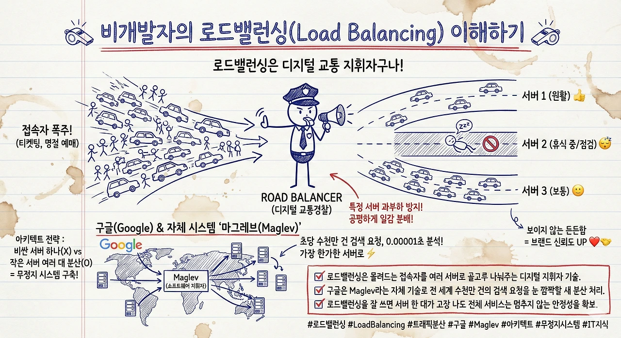 로드밸런싱은 몰려드는 손님들을 비어 있는 테이블로 착착 안내하는 '베테랑 호텔 지배인'이자 '디지털 교통경찰'과 비슷합니다. 한 명의 요리사(서버)에게만 모든 주문이 쏟아져 쓰러지지 않도록, 뒤에서 대기 중인 여러 명의 요리사에게 일감을 공평하게 나누어주는 영리한 배분 기술을 말하죠.